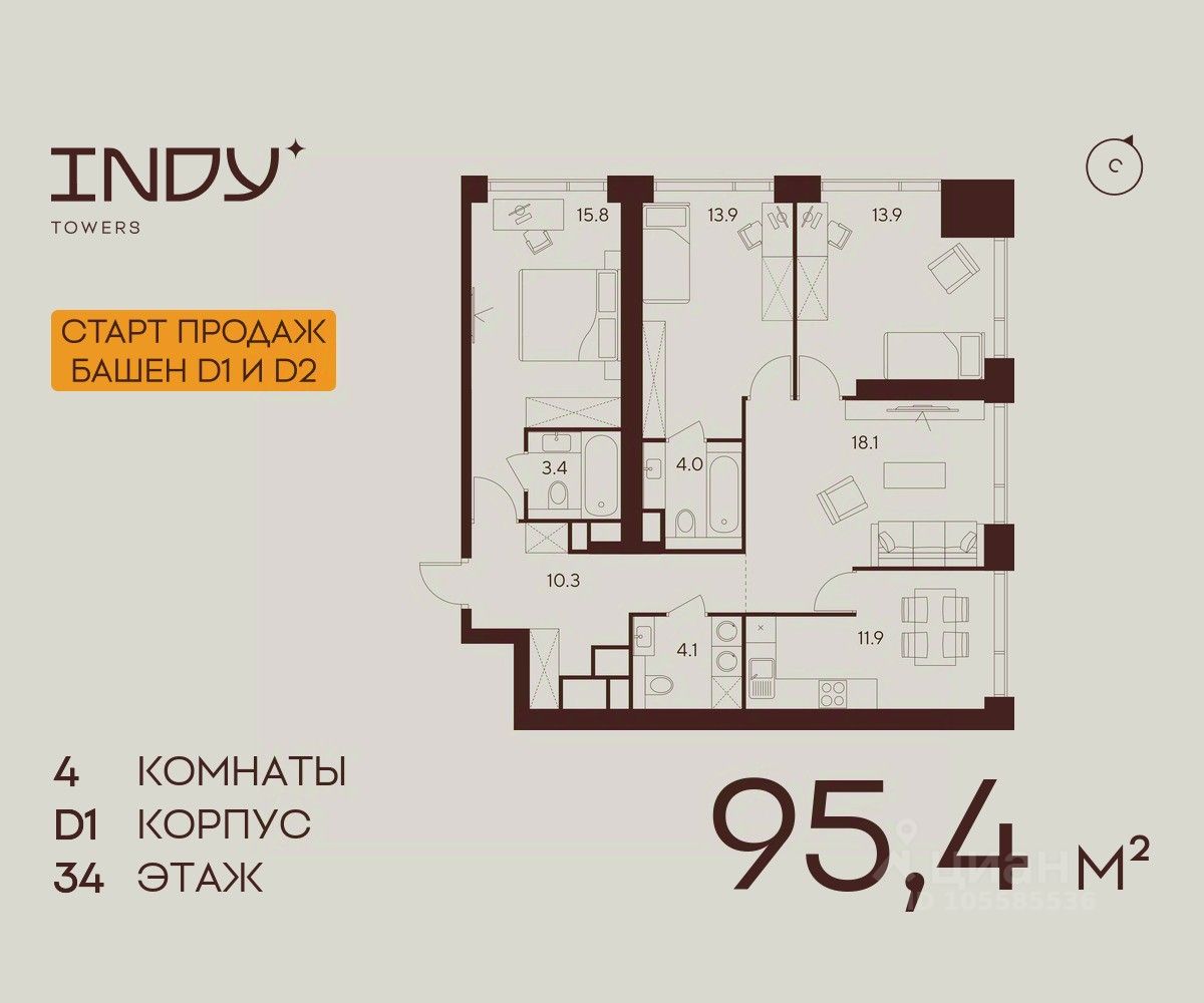 Продажа от застройщика. Продается просторная 4-комнатная квартира на 34 этаже жилого комплекса Indy Towers. Срок сдачи: 3 кв. 2029 г.