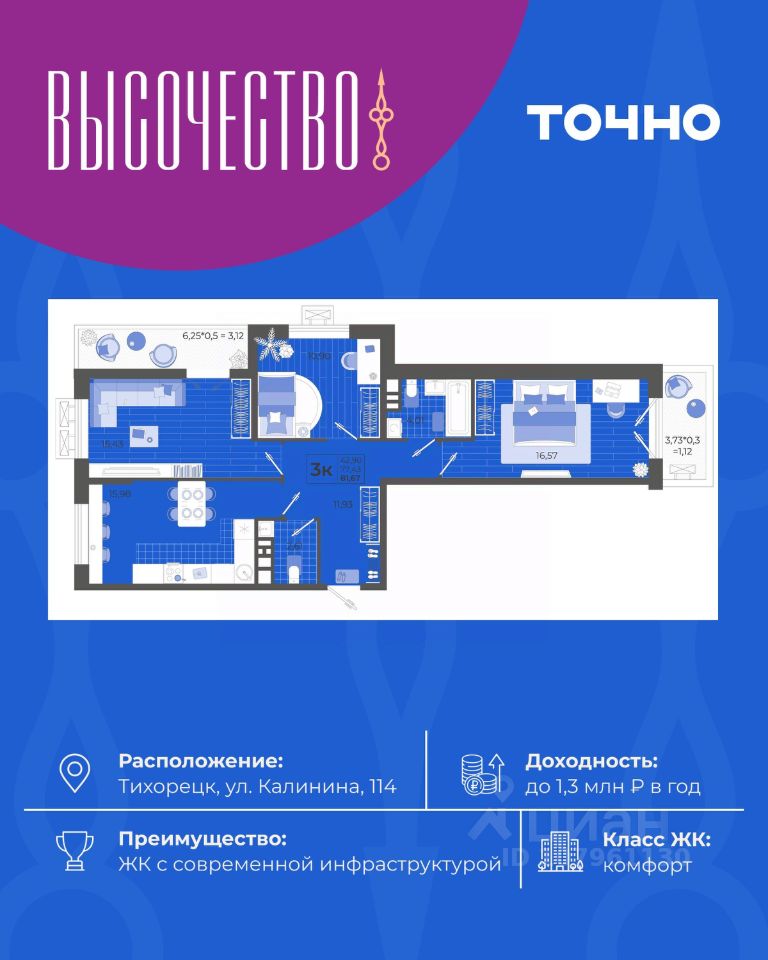 ''Высочество'' — первый ЖК комфорт-класса в Тихорецке. Современные технологии, новейшие представления о комфорте и эргономике жилья -это, то, что характеризует этот комплекс. Расположен в самом центре города. ''Высочество'' — это полностью самостоятельный жилой комплекс, жителей которого порадуют закрытый и свободный от машин двор, коммерческая галерея, спортивные и детские площадки с перголами для отдыха, уютная мангальная зона. По периметру жилого комплекса - открытый бесплатный паркинг на 370 м/мест. Недалеко от ЖК ''Высочество'' находятся детский сад, школы-гимназии, поликлиника, торговый центр, в пешей доступности расположен любимый сквер жителей города ''Звездный''.