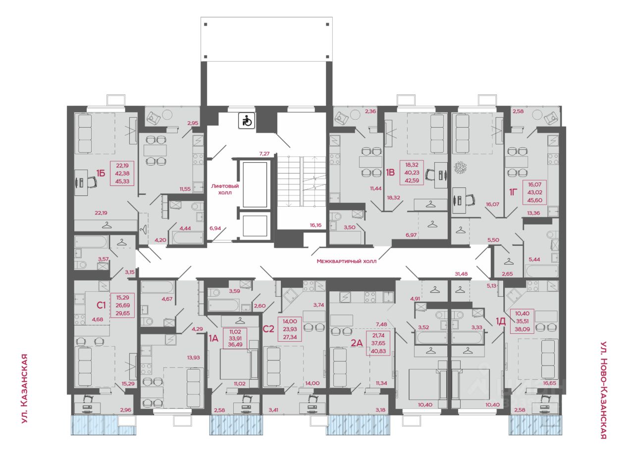 квартиры площадью от 27,34 до 86,94 м² электроразводка внутри квартир установлены розетки и выключатели оконные блоки из ПВХ с двойным стеклопакетом индивидуальные корзины для кондиционеров