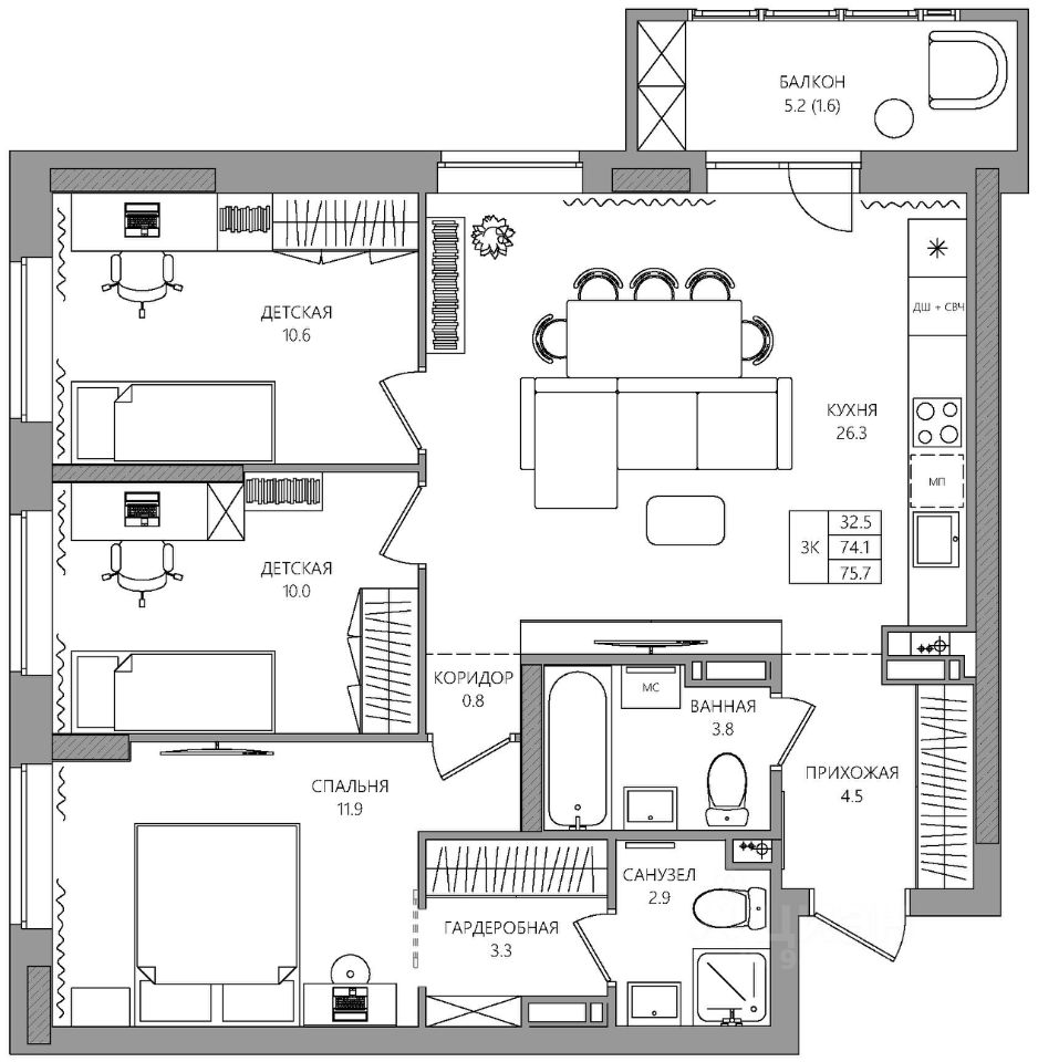 Общая площадь75,7 м2