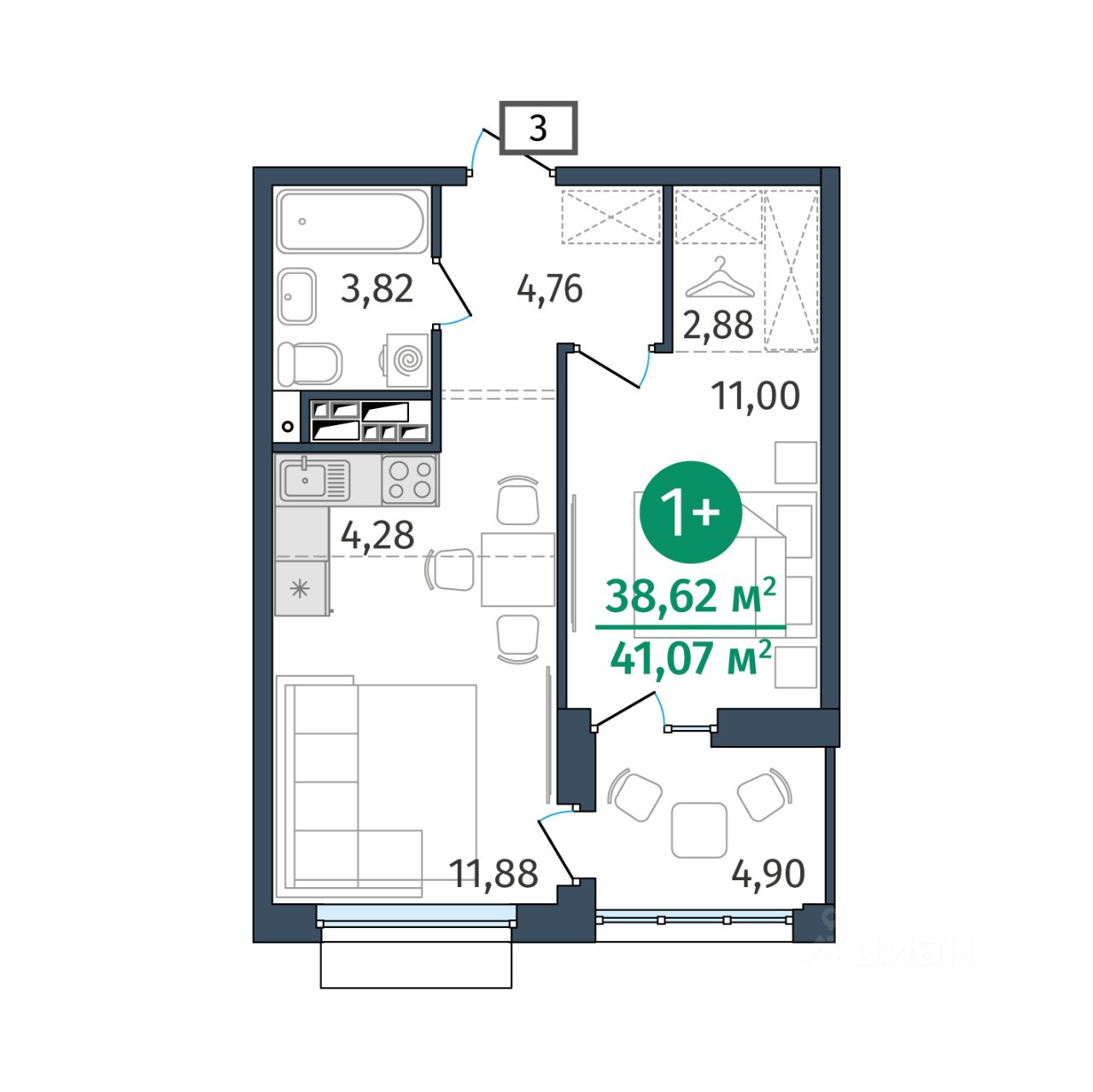 Общая площадь38,62 м2