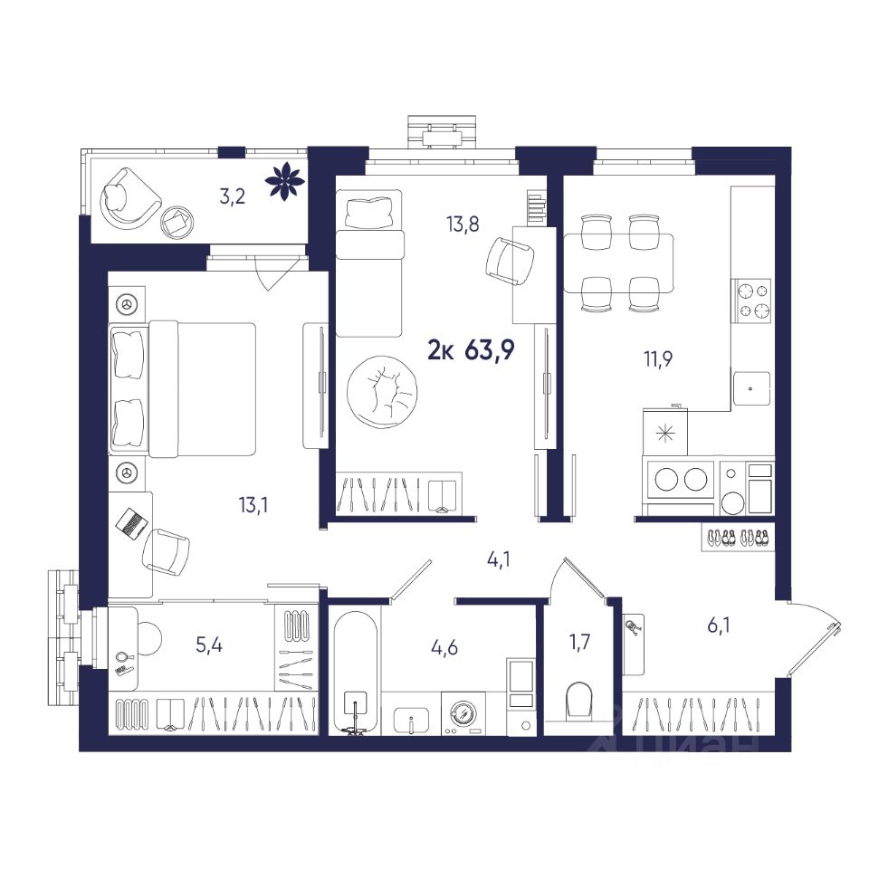 Общая площадь63,9 м2
