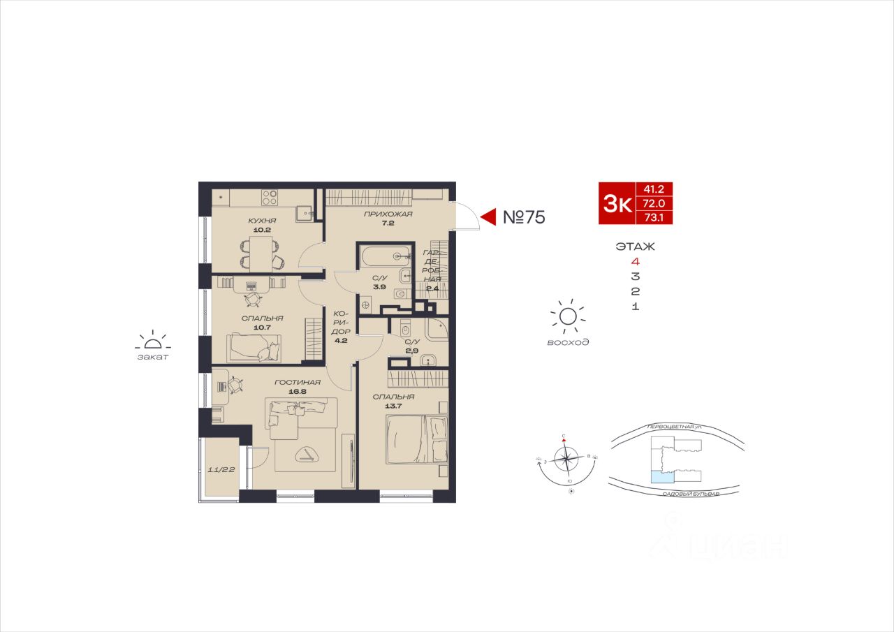 Продаётся 3-комнатная квартира в строящемся доме (Садовый, 73), срок сдачи: IV-кв. 2027, общей площадью 73.1 кв.м., на 4 этаже. Новый жилой комплекс ''Миниполис Култаево Парк'' от Специализированного застройщика ''Миниполис Култаево Парк'' расположен в с. Култаево по ул. Садовый бульвар.
