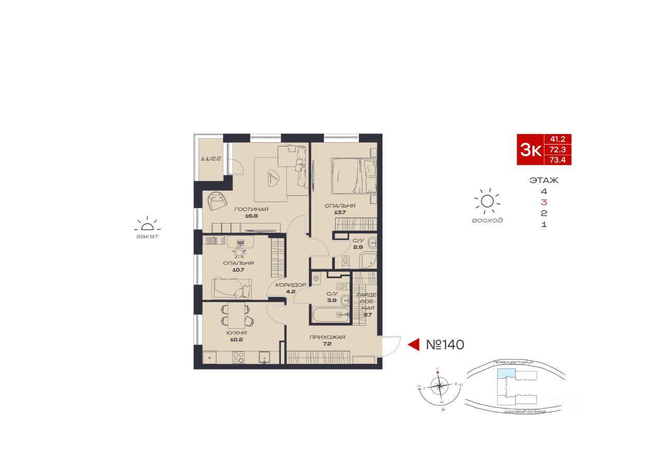 Продаётся 3-комнатная квартира в строящемся доме (Садовый, 73), срок сдачи: IV-кв. 2027, общей площадью 73.4 кв.м., на 3 этаже. Новый жилой комплекс ''Миниполис Култаево Парк'' от Специализированного застройщика ''Миниполис Култаево Парк'' расположен в с. Култаево по ул. Садовый бульвар.