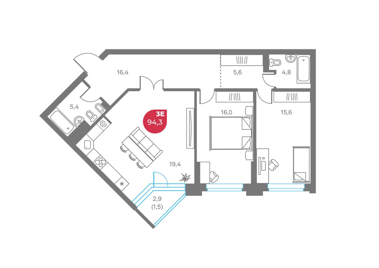 Общая площадь94,3 м2
