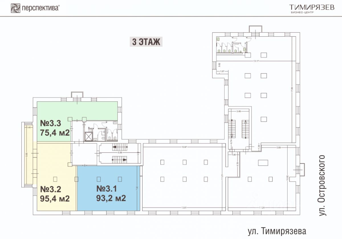 Преимущества БЦ:Первая линия: находится на пересечении центральных улиц Островского и Тимирязева, рядом с ТРК ''Семья'' и ТЦ ''Радуга''.Свежий ремонт общих зонУдобный вместительный паркинг во дворе и у входа в БЦ (50 м/м).