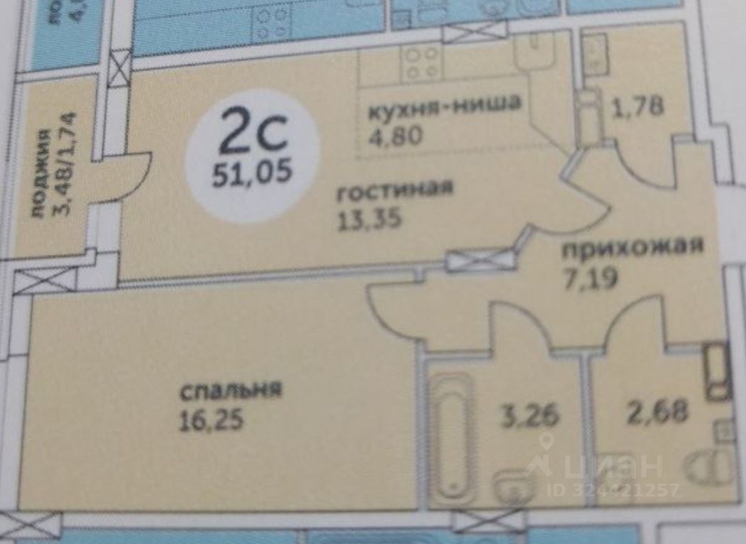 Общая площадь квартиры с лоджией 51,05 кв.м., без лоджии 49,1 кв.м.,жилая 16,25 кв.м., кухня-гостинная 18,5 кв.м., застекленная лоджия с видом на город . Гардеробная 1,78 кв.м. Санузел раздельный , большая ванна. Просторный коридор 7,2 кв.м.
