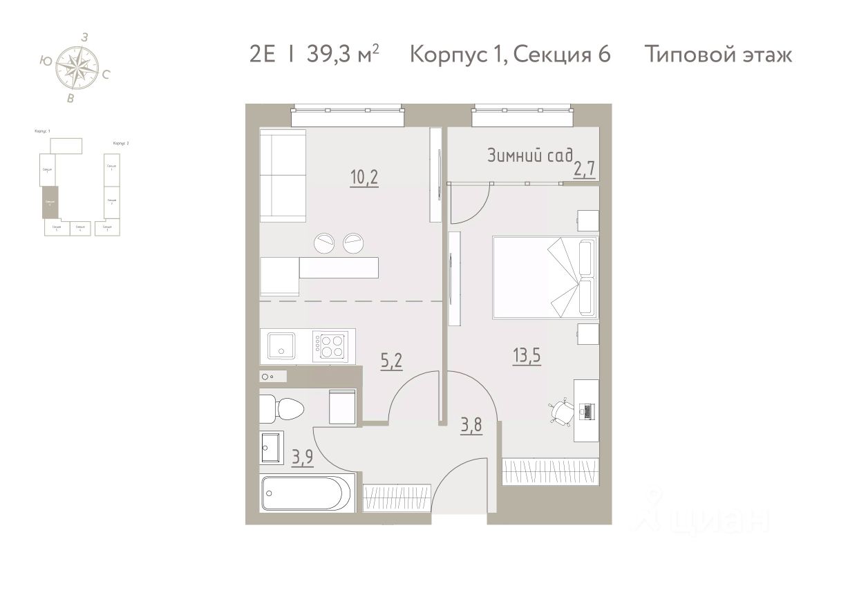 Общая площадь39,3 м2