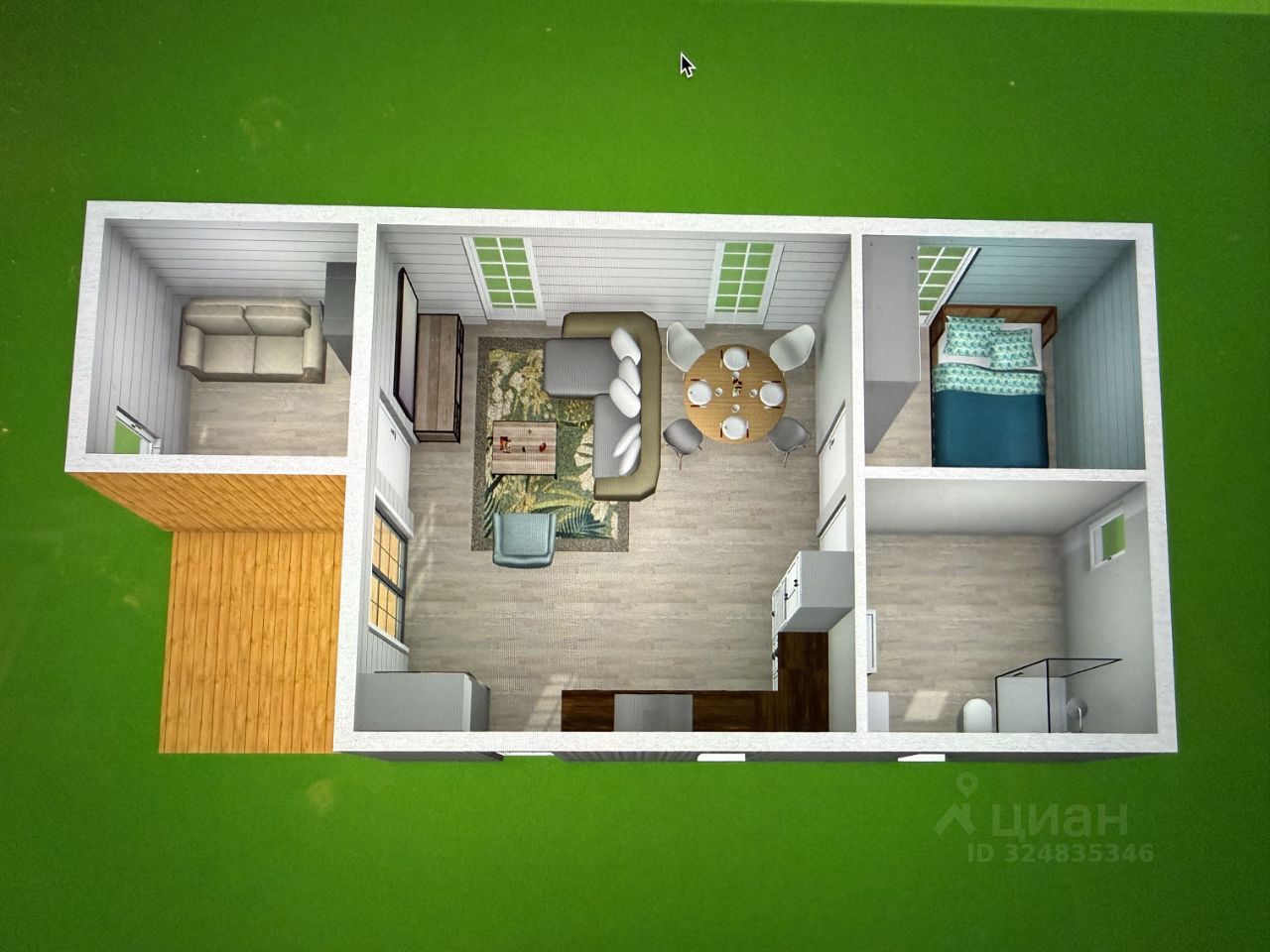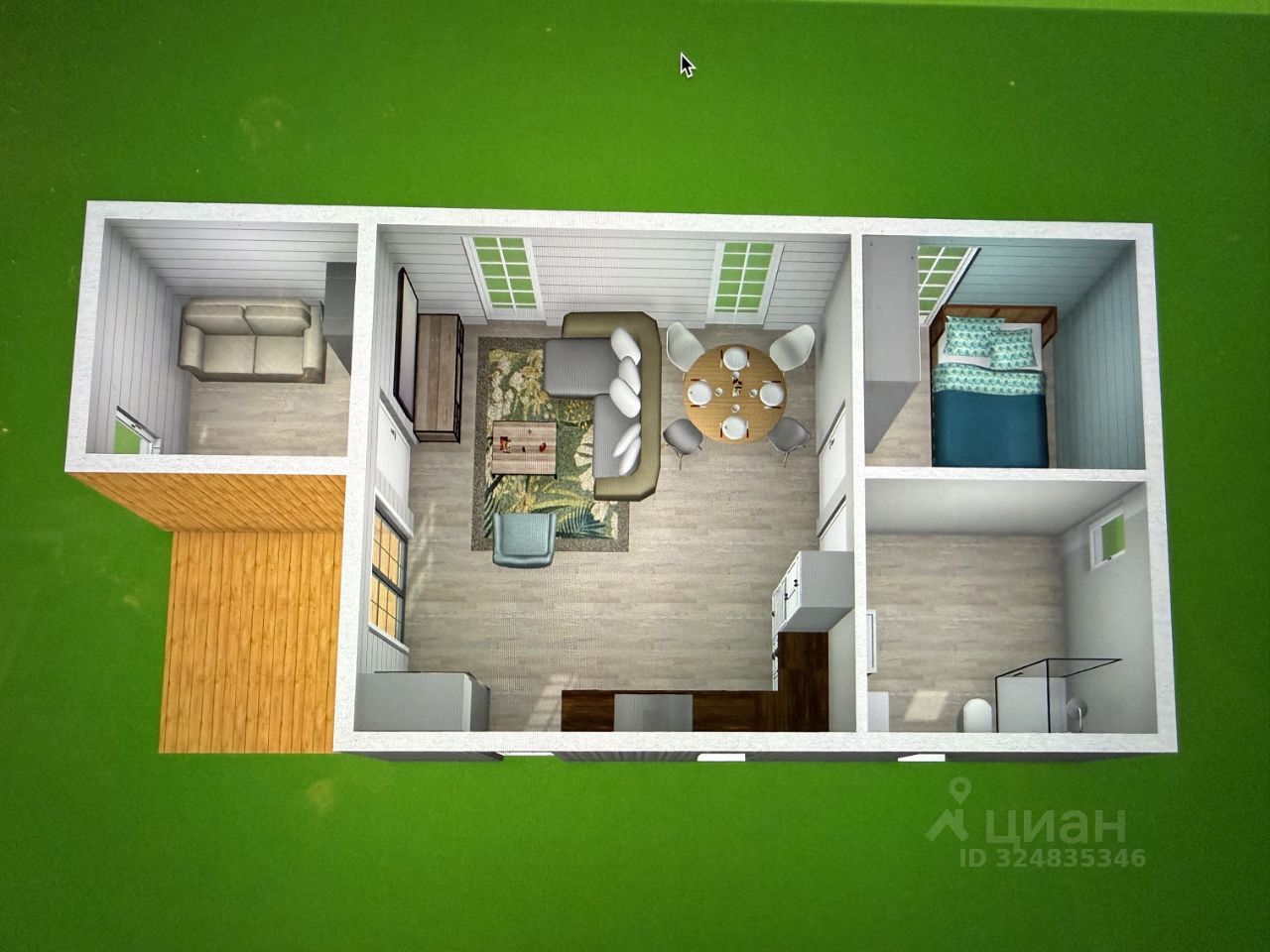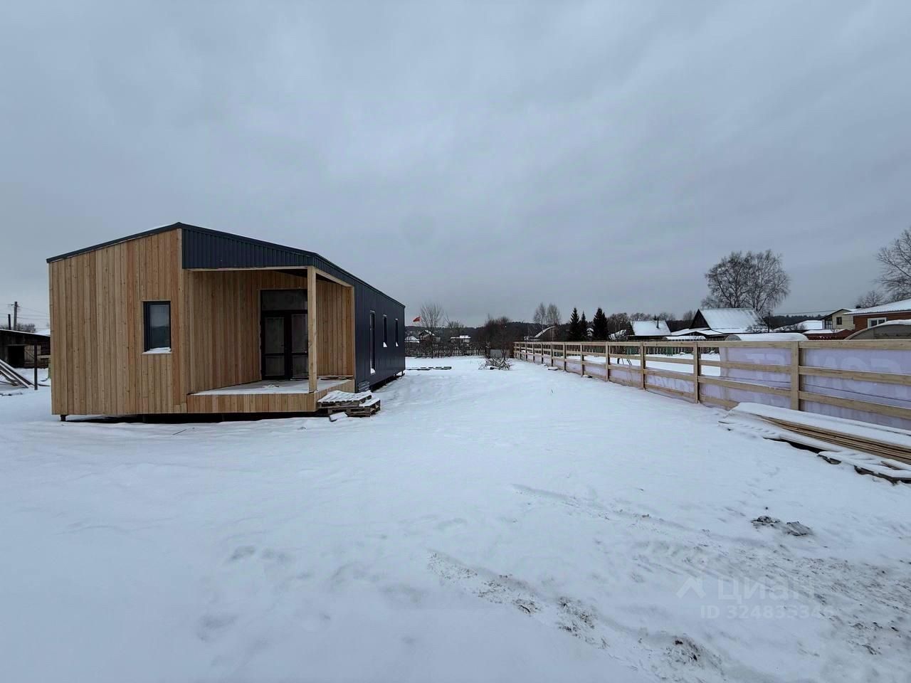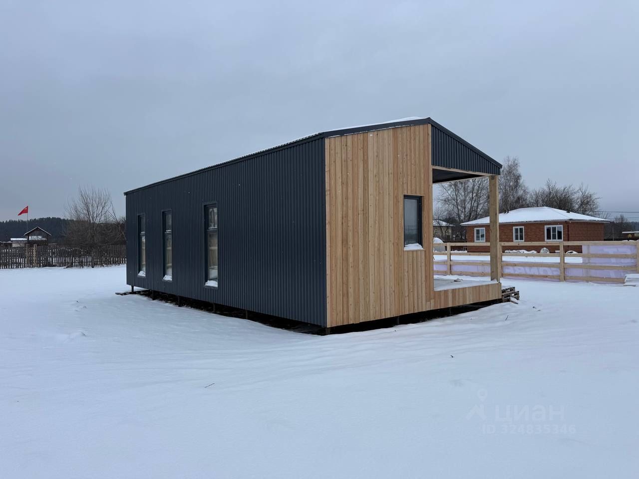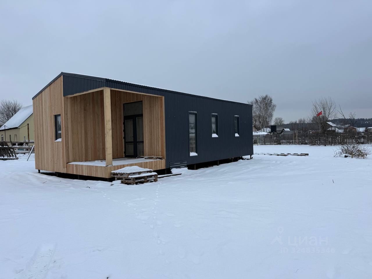 Двускатная крыша Чистовой пол - фанера Внешняя отделка - планкен из лиственницы / профлист 20 Внутренняя отделка - комбинированная из фанеры , имитация бруса и планкен Панорамные окна Терраса - пол выполнен из твёрдых пород дерева лиственницы.