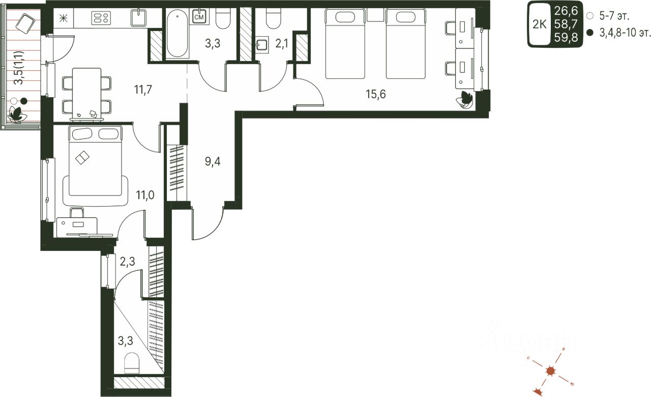 Продаётся 2-комнатная квартира в строящемся доме (Серебристая, 1), срок сдачи: IV-кв. 2027, общей площадью 59.8 кв.м., на 9 этаже. Теплые кварталы ''Погода'' — это новый грандиозный проект от создателя Спортивного микрорайона ''Ива'', федерального застройщика ''Девелопмент-Юг'' .