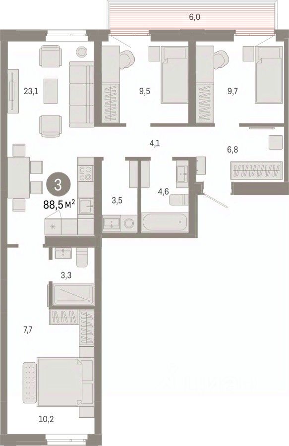 3-комн. квартира с предчистовой отделкой в ЖК ''Республики 205'' на 6 этаже. Общая площадь: 88.47 кв.м., жилая: 29.4 кв.м., площадь просторной кухни-гостиной: 23.1 кв.м. Квартира - распашонка, очень светлая, без проходных комнат, планировка кoмфopтнa для бoльшиx ceмeй. В квартире два балкона, два совмещенных санузла. Высота потолков 2.7 м.