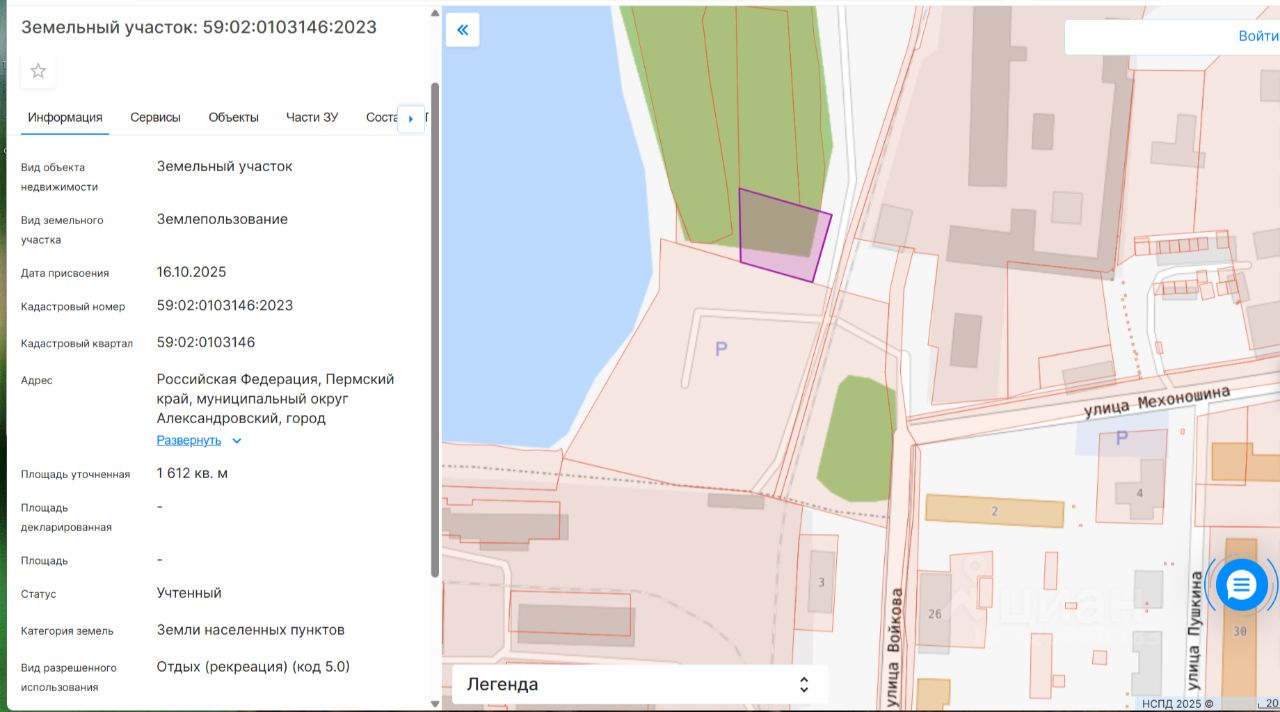 Данные получены с сайта ГИС Торги. Земельный участок с кадастровым номером 59:02:0103146:2023 площадь 1612 по адресу Российская Федерация, Пермский край, муниципальный округ Александровский, город Александровск
