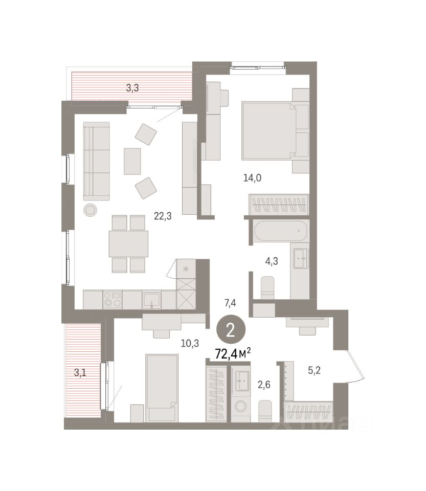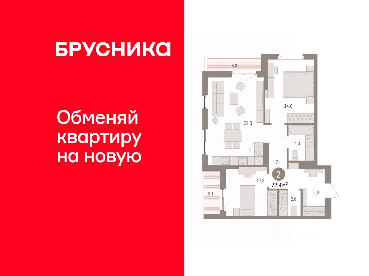 2-комн. квартира с предчистовой отделкой в ЖК ''Квартал ''Юность'''' на 3 этаже. Общая площадь: 72.42 кв.м., жилая: 24.3 кв.м., площадь просторной кухни-гостиной: 22.3 кв.м. Угловая квартира, окна oбecпeчивaют paвнoмepнoe ocвeщeниe в тeчeниe дня. В квартире две лоджии, один совмещенный и один раздельный санузел. Высота потолков 2.7 м.