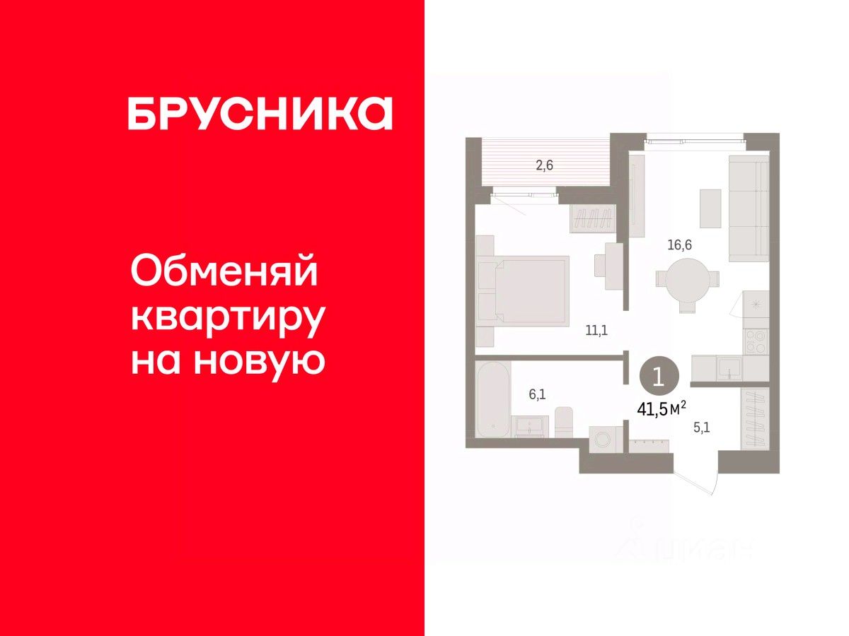 Квартира с кухней-гостиной и одной спальней в квартале ''Юность''. Особенности планировки: лоджия. квартиры в нашей базе: ЮСТ01-Ж1.14.5.