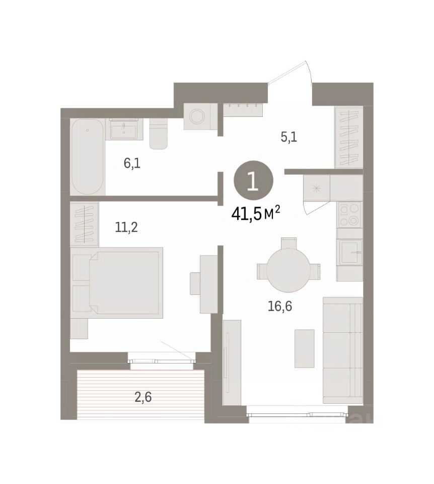 Квартира с кухней-гостиной и одной спальней в квартале ''Юность''. Особенности планировки: вид во двор, лоджия. квартиры в нашей базе: ЮСТ01-Ж1.4.8.