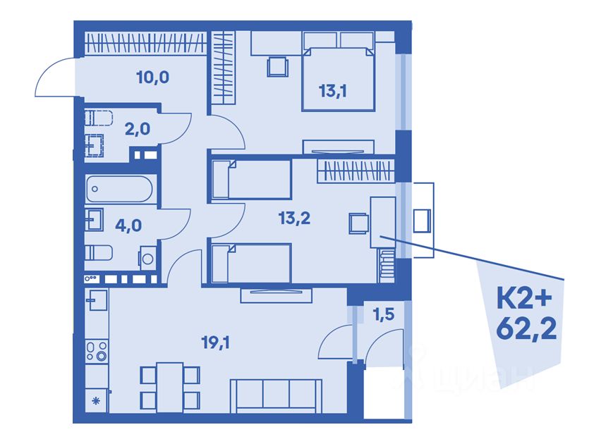 Общая площадь62,2 м2