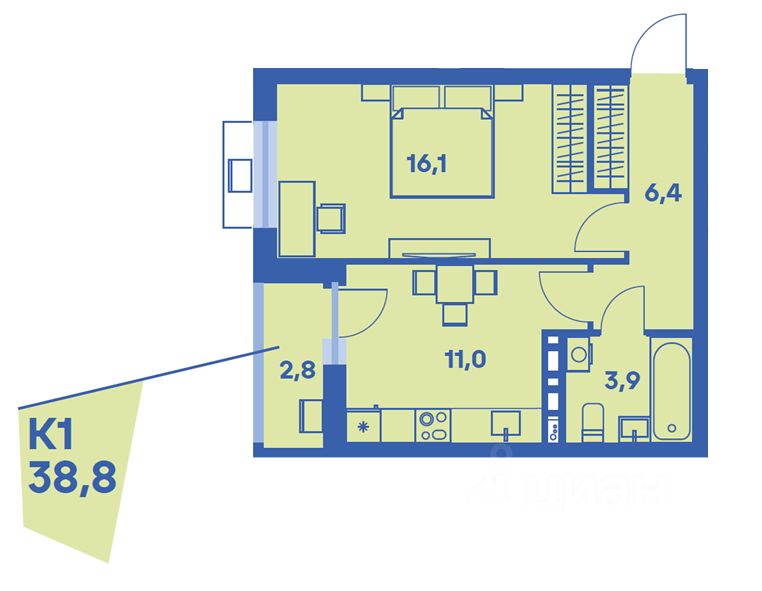 Общая площадь38,8 м2