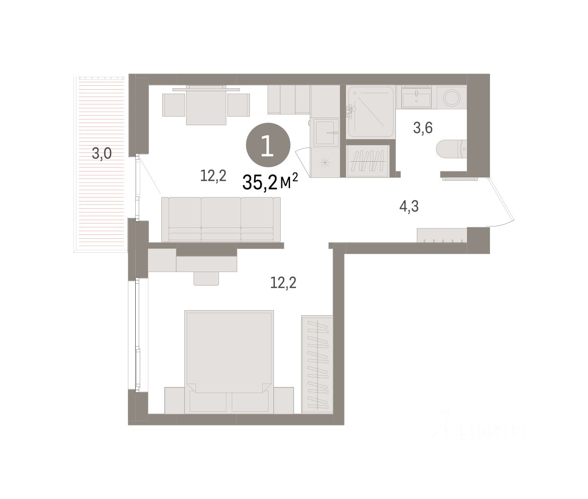 Квартира с кухней-гостиной и одной спальней в квартале ''Юность''. Особенности планировки: балкон. квартиры в нашей базе: ЮСТ01-Ж3.2.5.