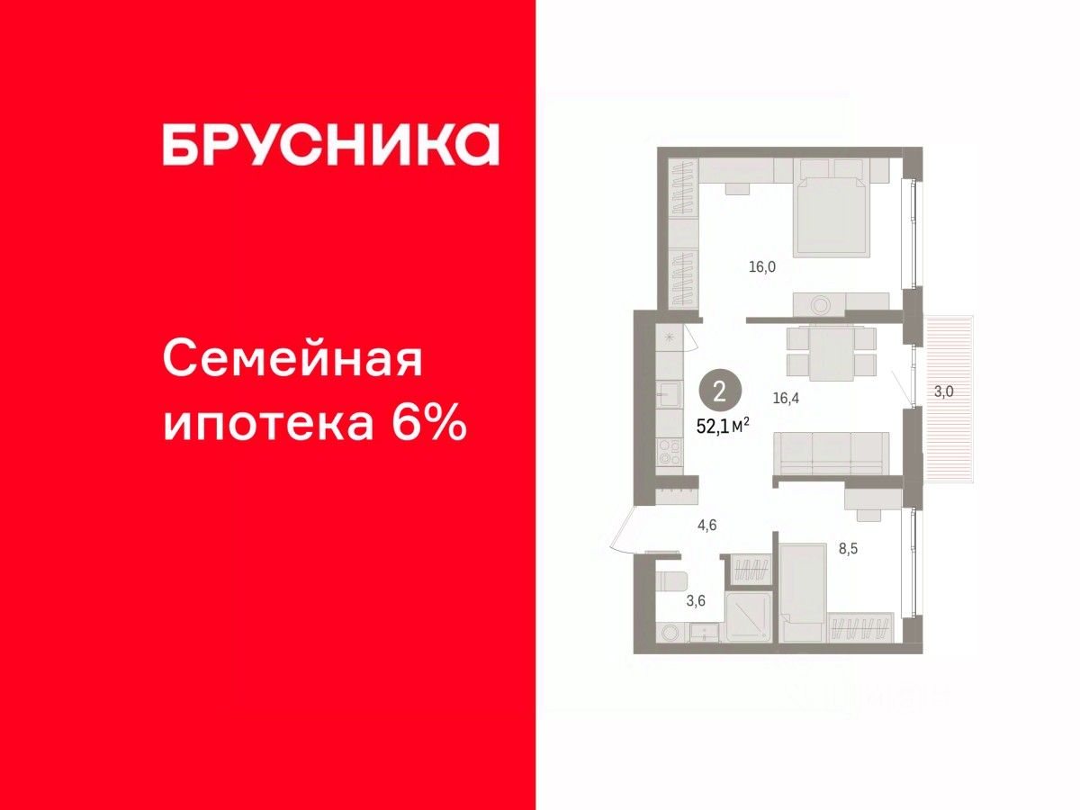 Квартира с кухней-гостиной и двумя спальнями в квартале ''Юность''. Особенности планировки: балкон, вид во двор, разнесённые спальни.