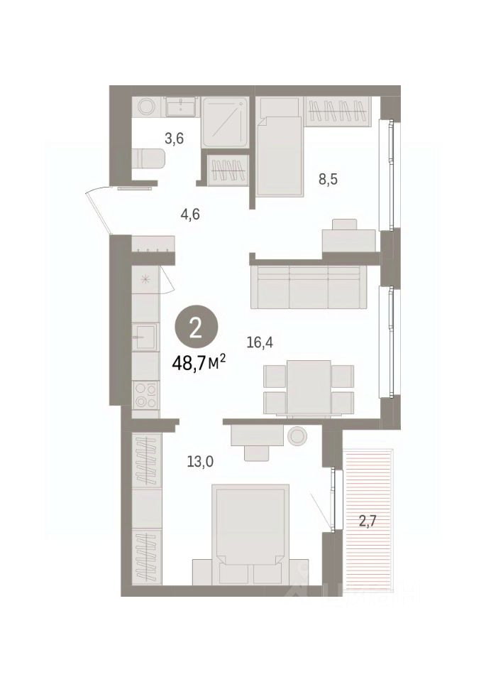 2-комн. квартира от застройщика с предчистовой отделкой в ЖК ''Квартал ''Юность'''' на 7 этаже. Общая площадь: 48.84 кв.м. Высота потолков 2.7 м.