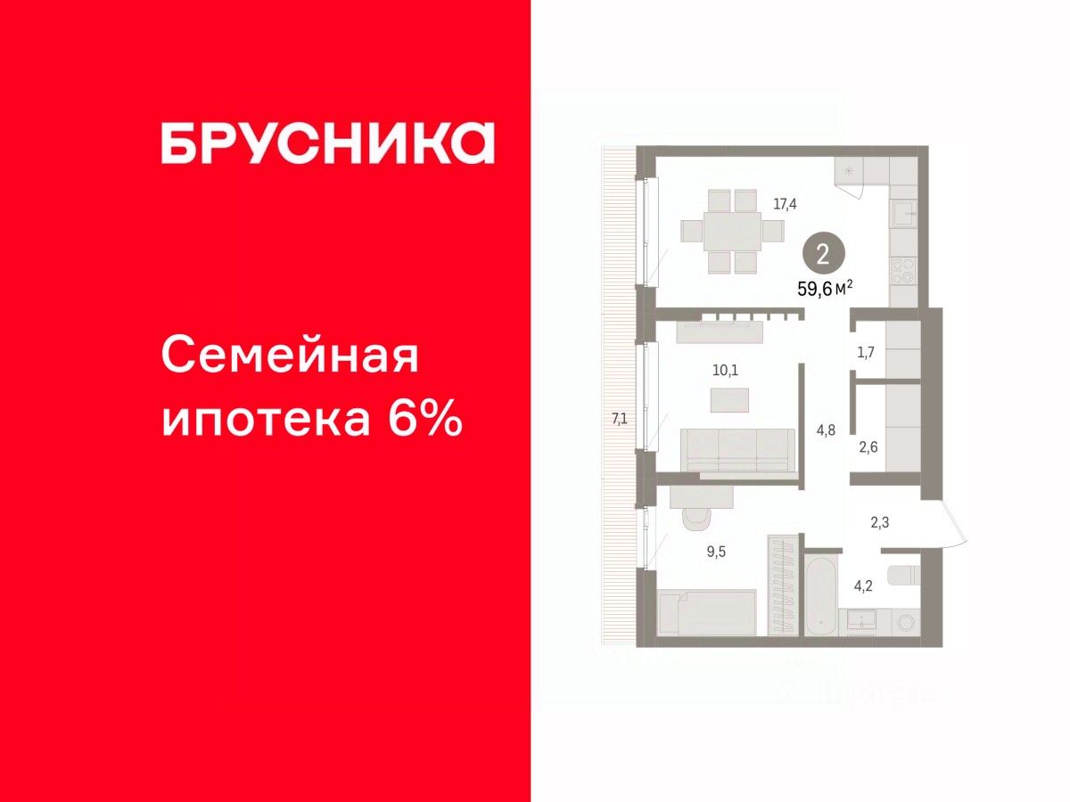 Продается двухкомнатная квартира с предчистовой отделкой в ЖК ''Квартал ''Юность'''' на 8 этаже. Общая площадь: 59.62 кв.м., жилая: 19.6 кв.м., площадь просторной кухни-гостиной: 17.4 кв.м. Комнаты изолированные, все окна выходят на одну сторону. В квартире один балкон, один совмещенный санузел. Высота потолков 2.7 м.