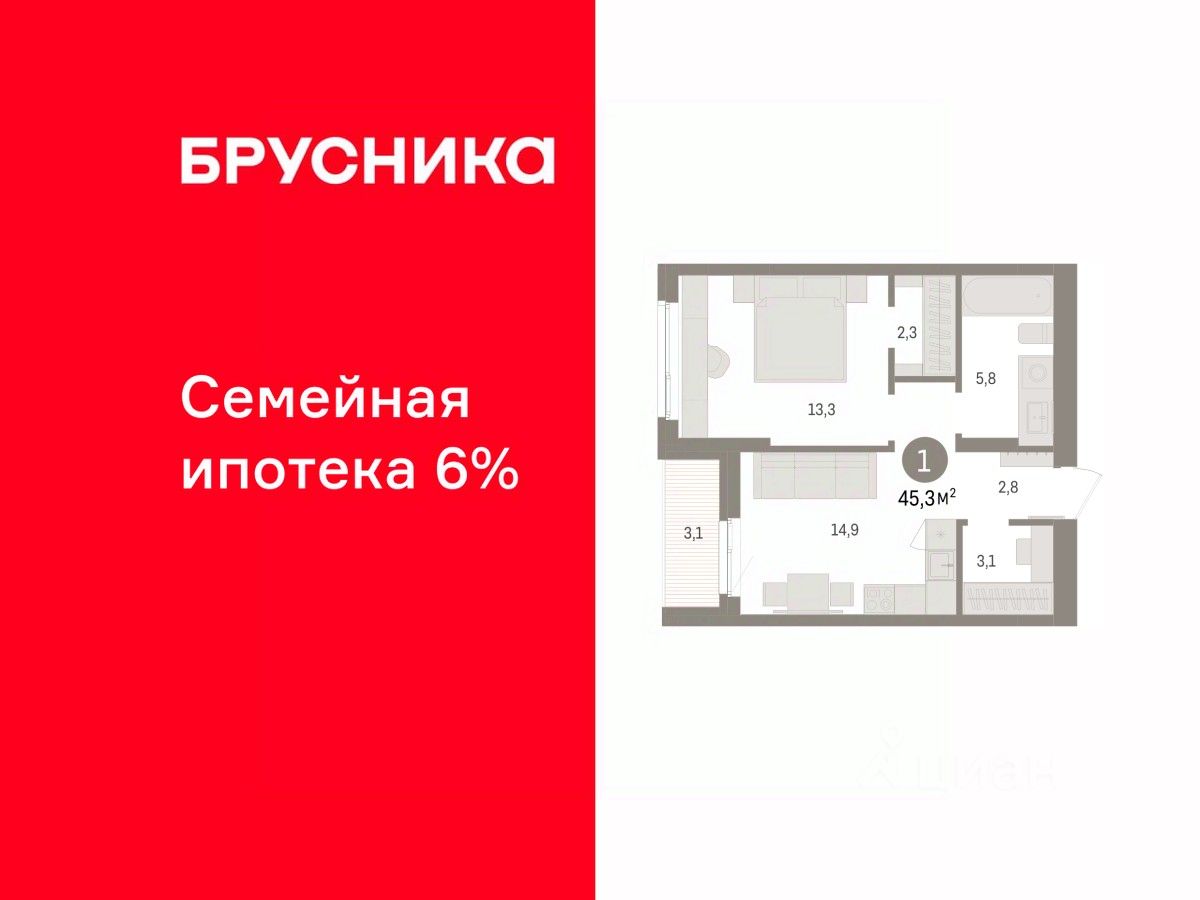 Квартира с кухней-гостиной и одной спальней в квартале ''Юность''. Особенности планировки: гардеробная, лоджия. квартиры в нашей базе: ЮСТ01-Ж4.5.3.