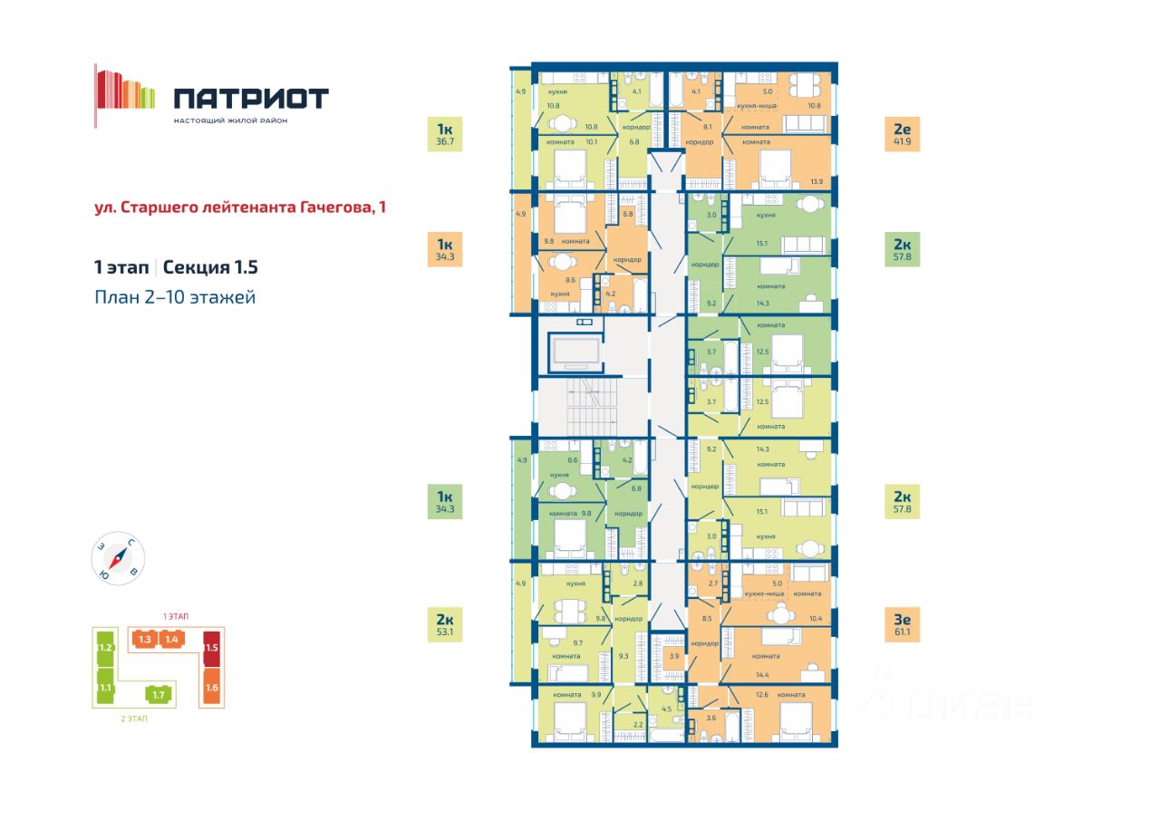 О первом этапе: Адрес: ул. Гачегова, 1.Этажность: 8-10 этажей. Срок сдачи: II кв. 2026 г. - III кв. 2026 г.