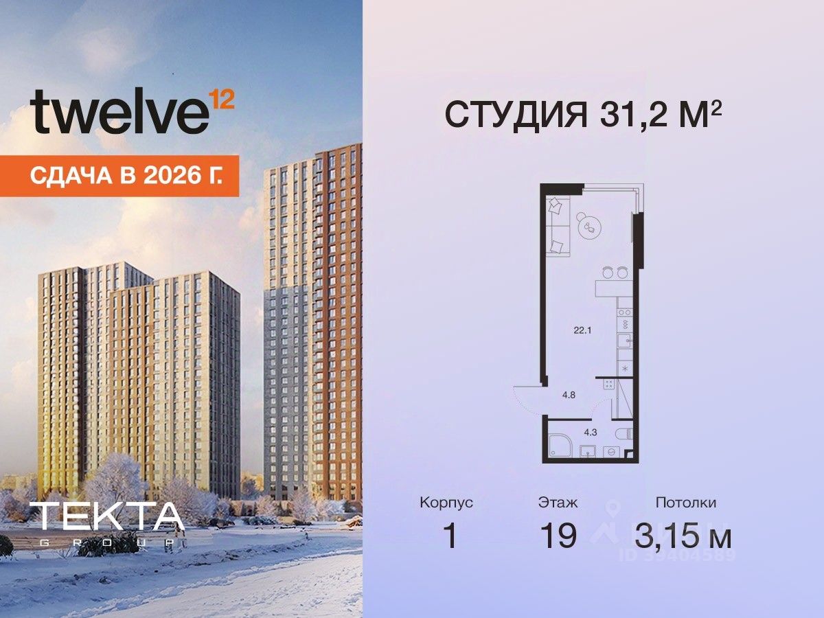 1-комн. квартира-студия в ЖК ''Twelve'' на 19 этаже в 34 этажном здании Корпус 1. Общая площадь: 31.2 кв.м., жилая: 14.20 кв.м. Высота потолков 3.15 м.