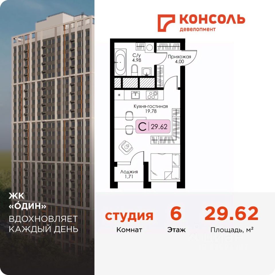 Площадь 29.62 на 6 этаже.