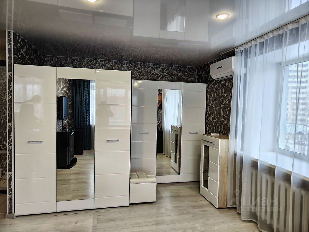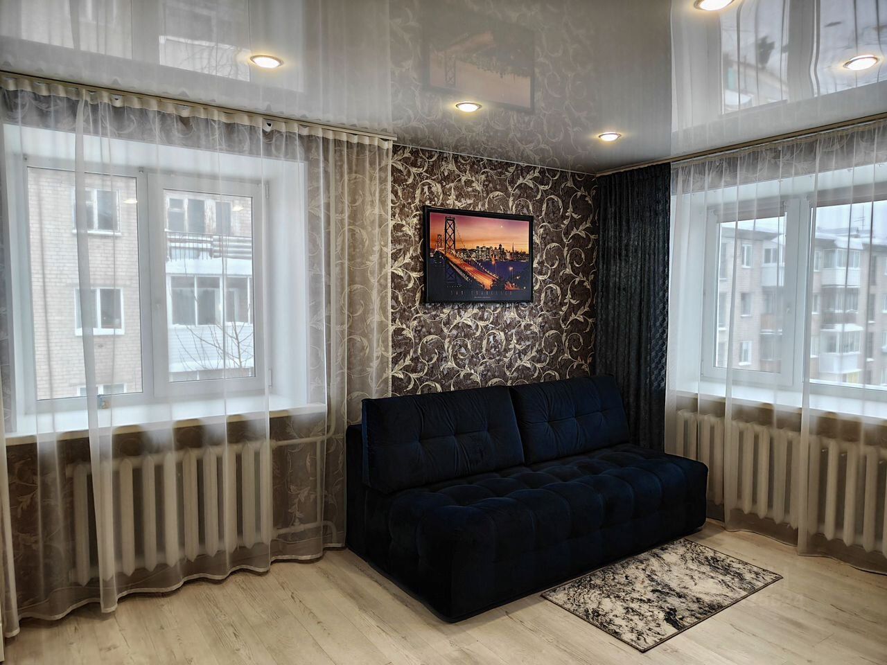 Из мебели есть все необходимое - кухня(кухонный стол, кухонный гарнитур), хранение одежды(шкафы, тумбы), спальные места(двуспальный диван).
