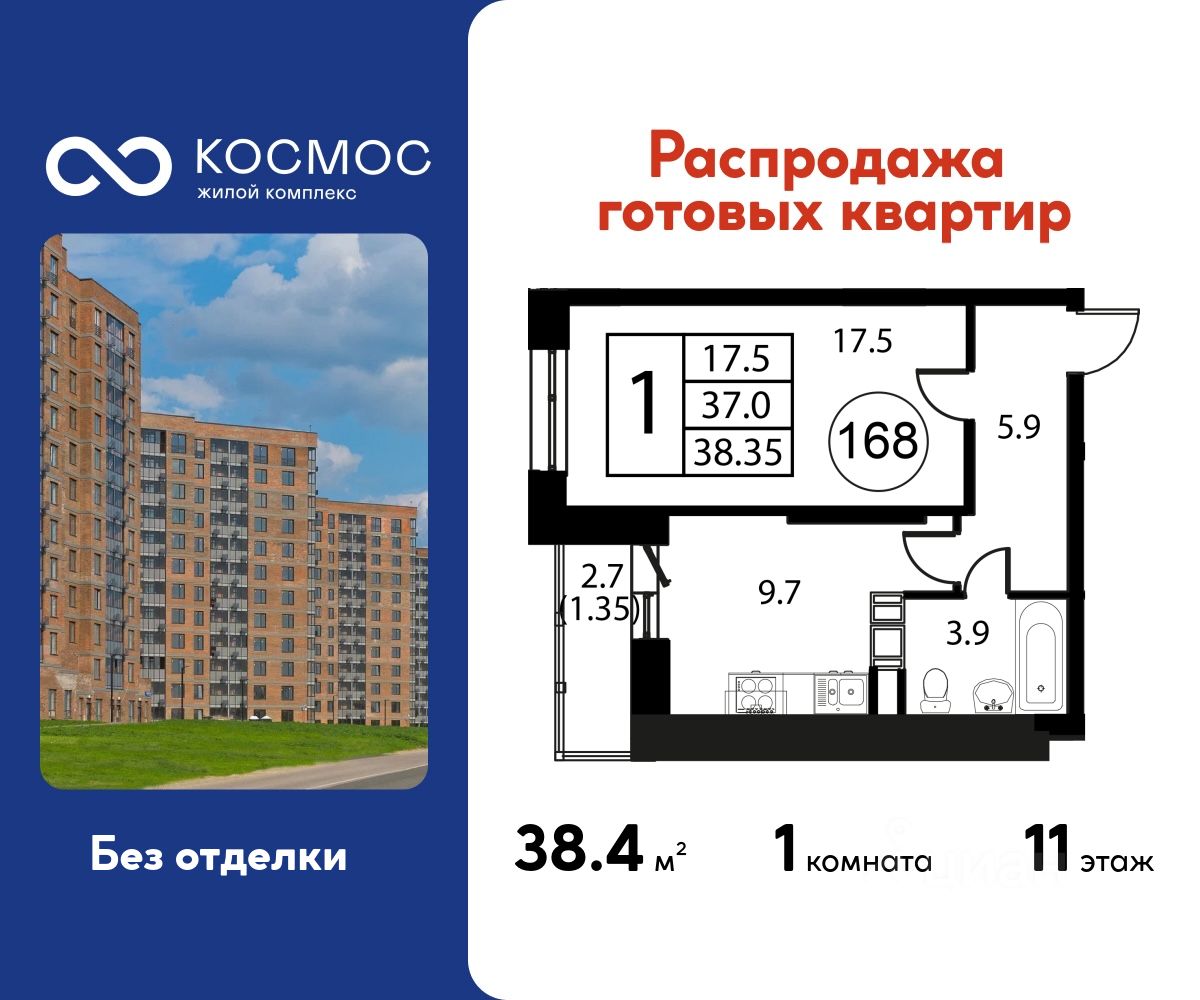 Продаётся 1-комнатная квартира в сданном доме (Корпус 7), срок сдачи: 2-кв. 2025, общей площадью 38.35 кв.м., на 11 этаже.