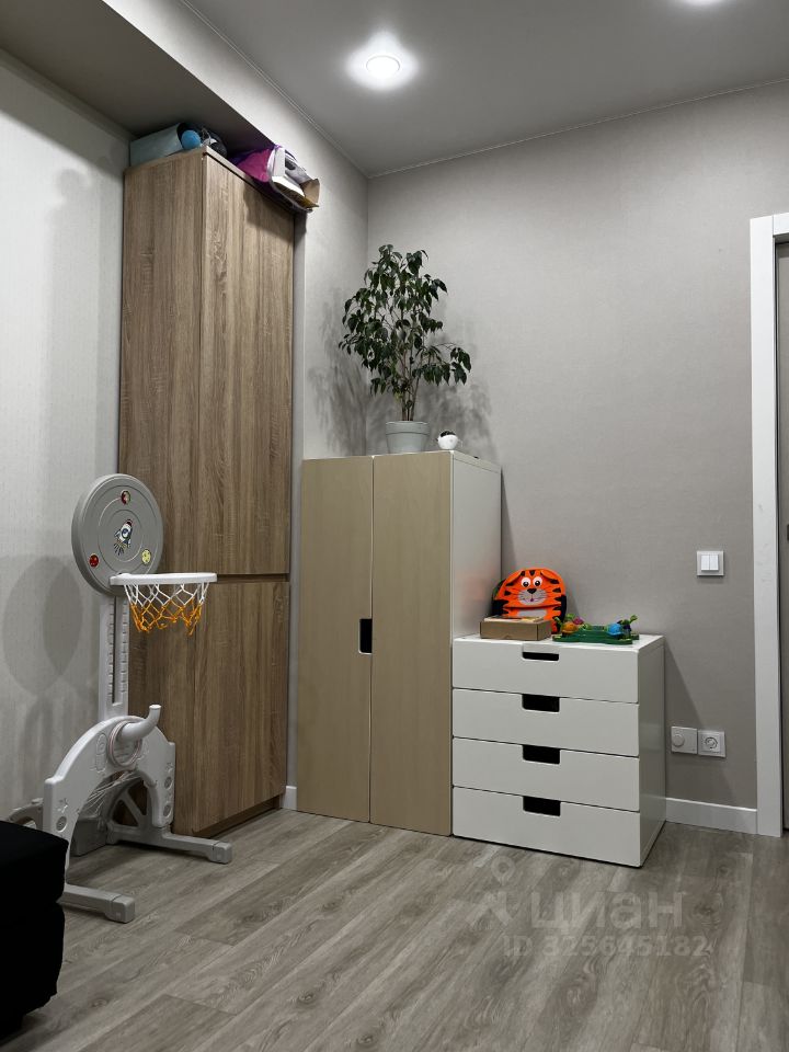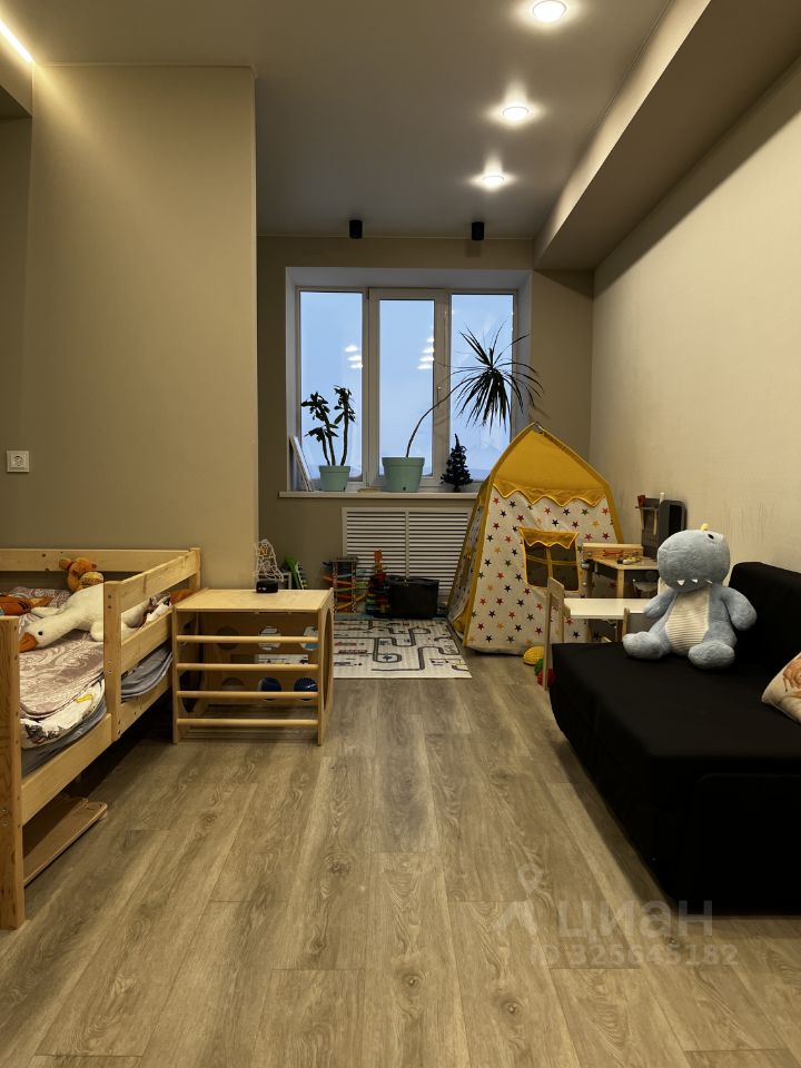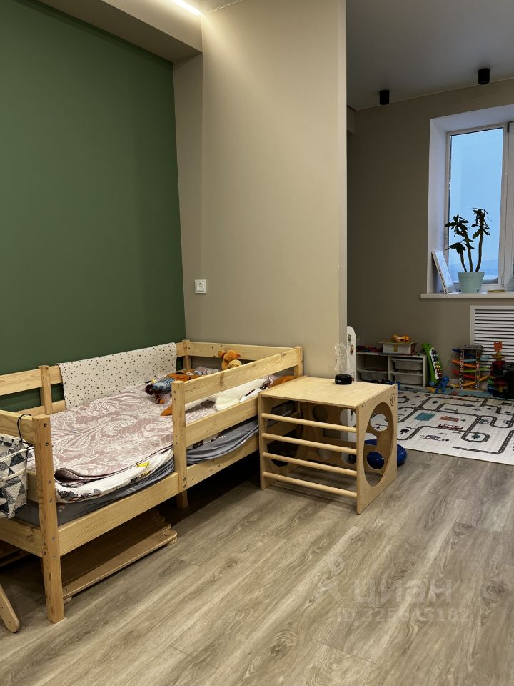 Детская: В комнате возведена дополнительная перегородка, что позволяет зонировать комнату и предусмотреть разные пространства для ребенка(рабочая, игровая, спортивная, для отдыха и сна). Окна выходят на восток, в первую половину дня в комнате солнечно. Предусмотрена рабочая зона с розетками и интернет-кабелем.
