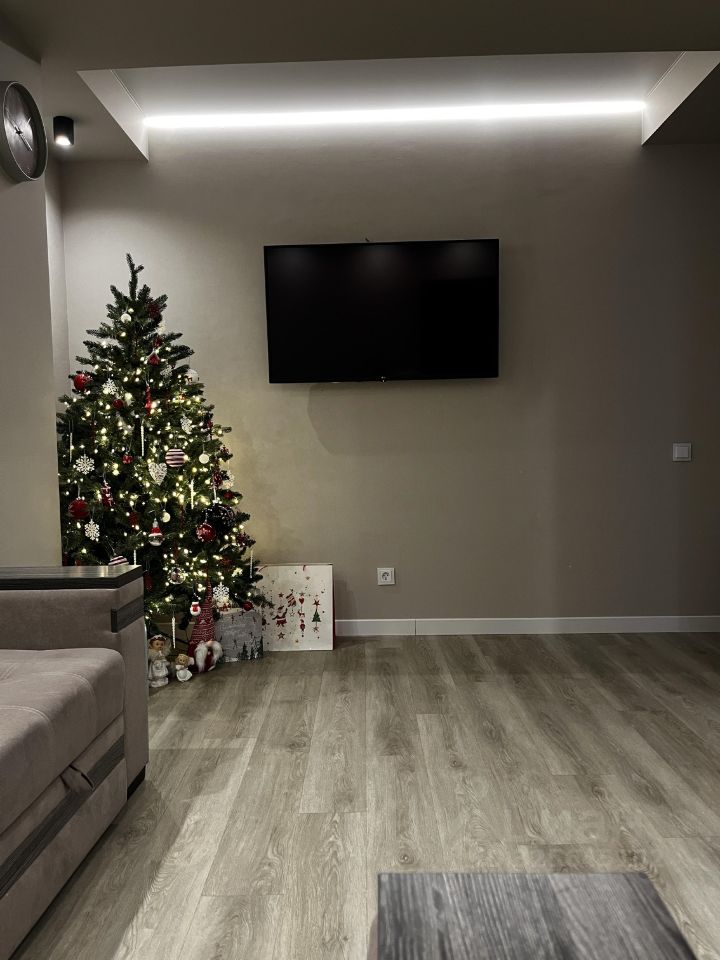 Холл-зона гостиной: Просторная комната, сердце квартиры. Угловой диван с местом для хранения. Тв зона со скрытым кабелем для Wi-fi.