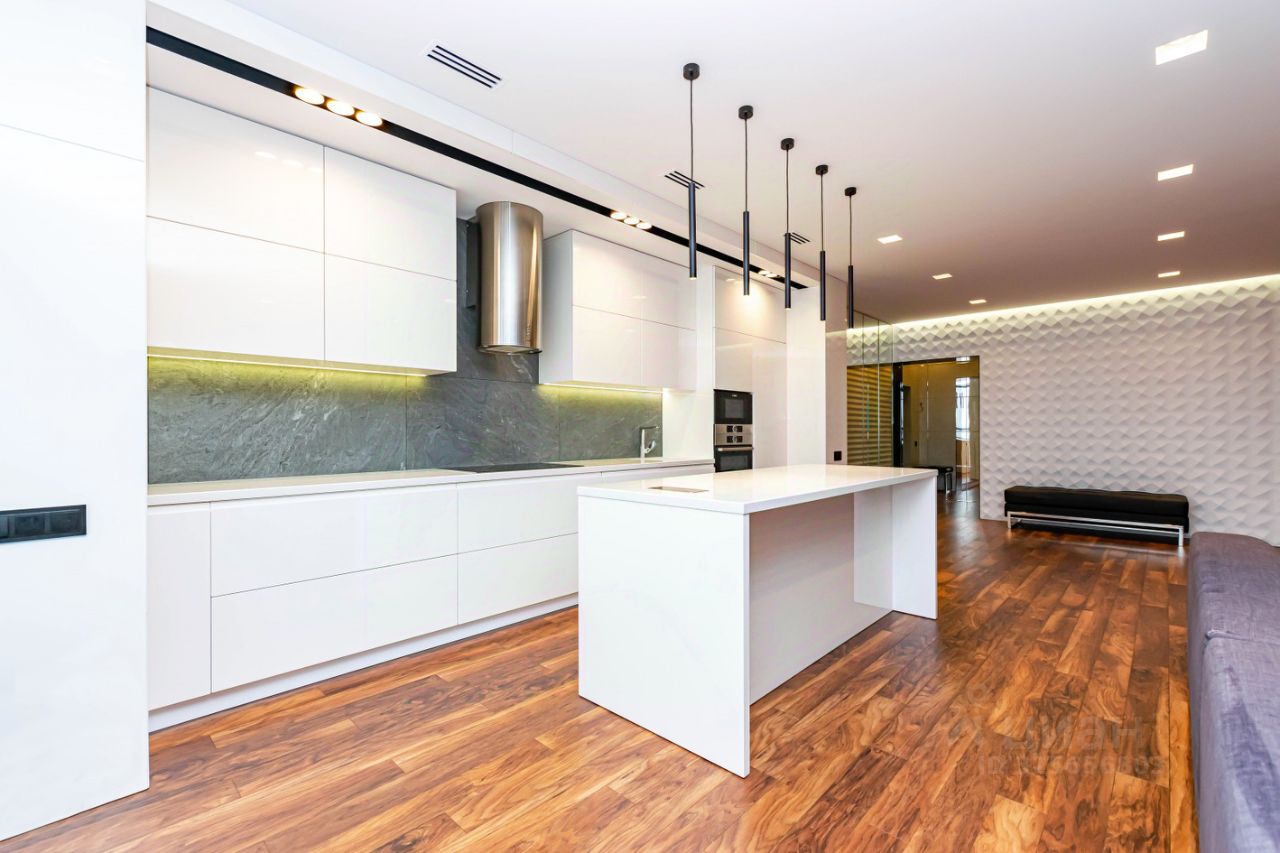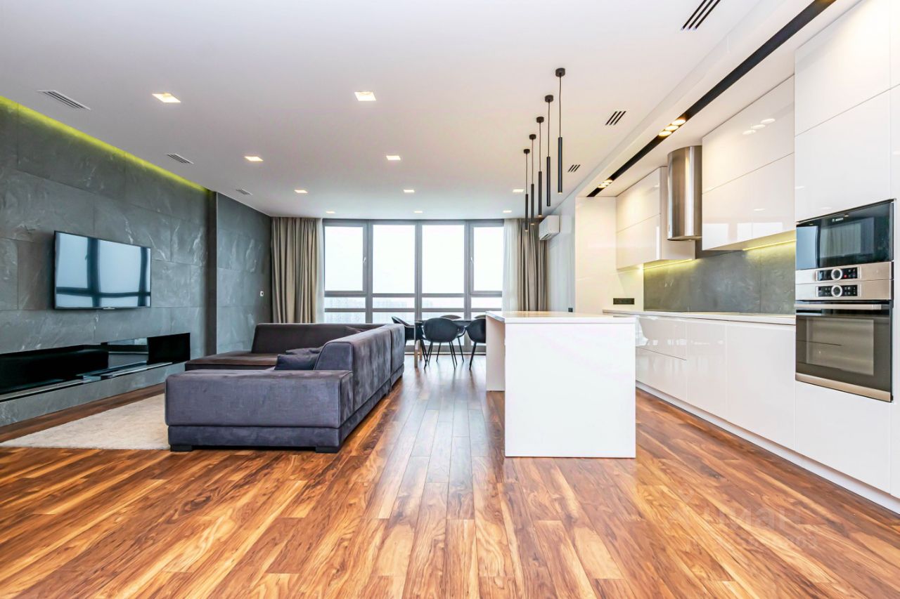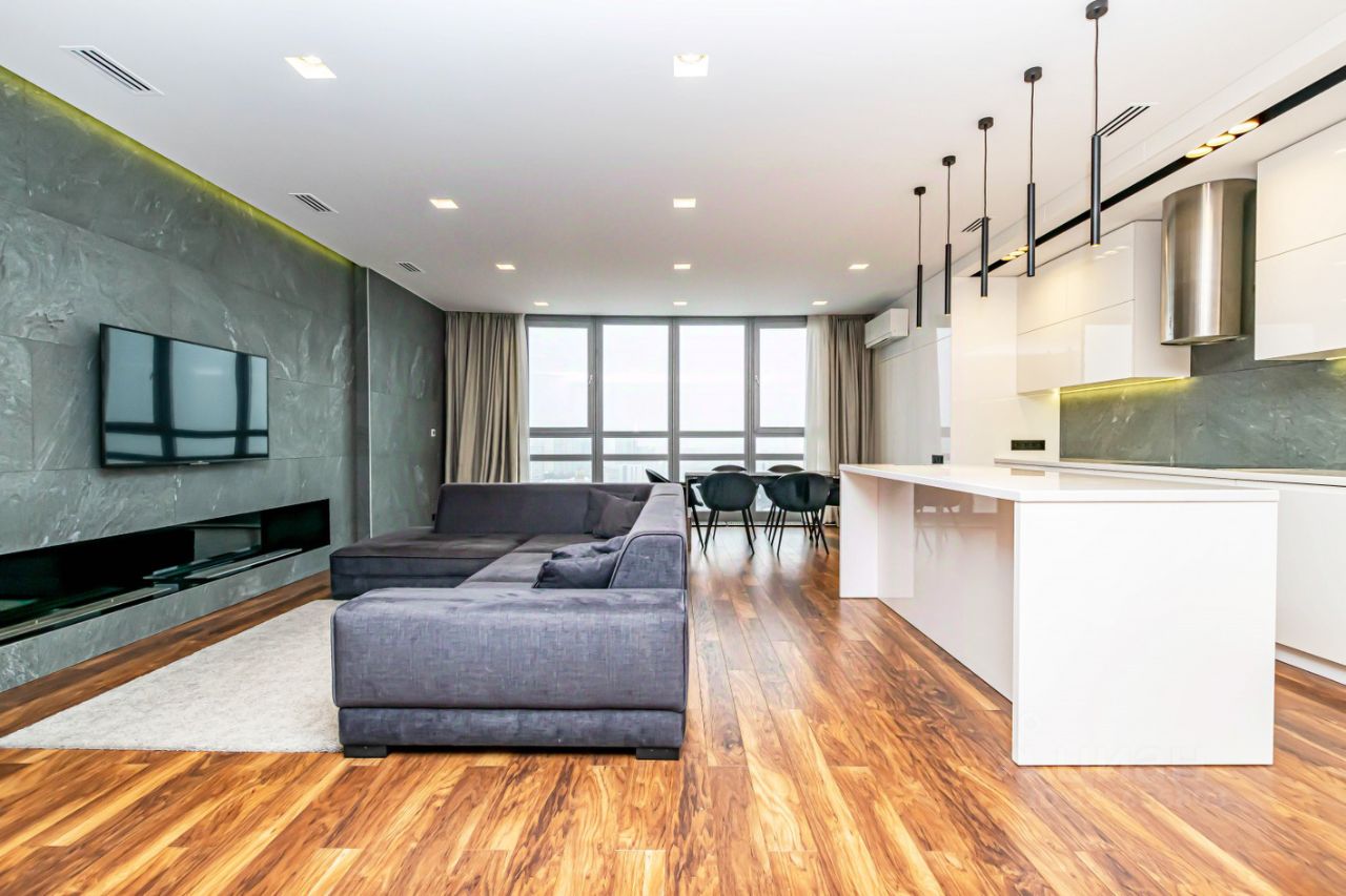 Огромная кухня гостиная, три изолированные спальни, ремонт выполнен известным дизайнерским бюро только из премиальных материалов.