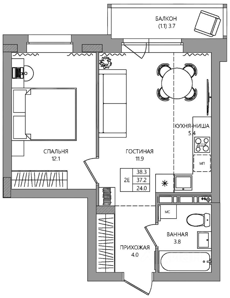 Общая площадь38,3 м2