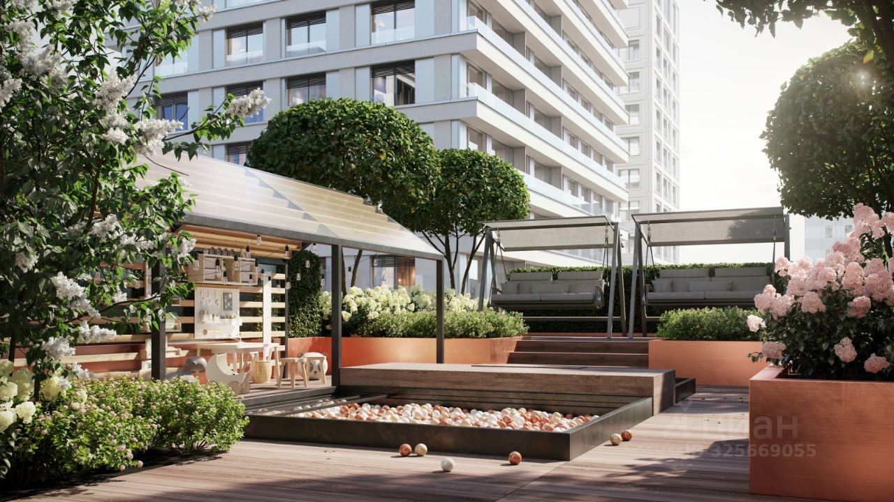Рядом с игровой комнатой появится пространство для детей — в хорошую погоду их можно объединить. Пока дети лепят песочные куличики или придумывают сюжеты в игровом домике, родители смогут приглядывать за ними, раскачиваясь в подвесных креслах с книгой или ноутбуком. А для спокойного отдыха взрослых и разговоров наедине организуем тихую зону у зенитного фонаря. На террасе — спокойная зелень, бело-розовое цветение, медные акценты в сочетании с серым камнем и террасной доской. По периметру — стеклянные ограждения и живая изгородь, которые делают пространство безопасным и по-настоящему приватным. #z69fDf