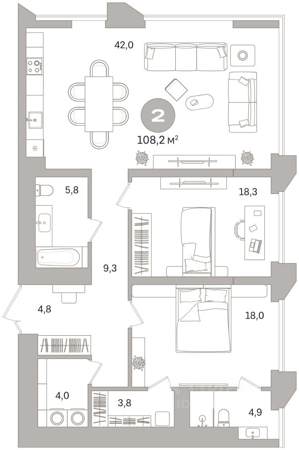 Продается двухкомнатная квартира от застройщика с предчистовой отделкой в ЖК ''Гоголя 21'' на 10 этаже. Общая площадь: 108.18 кв.м., жилая: 36.3 кв.м., площадь просторной кухни-столовой: 42 кв.м. Квартира угловая, идеально подойдет любителям тишины и панорамных видов. В квартире два совмещенных санузла. Высота потолков 2.98 м.
