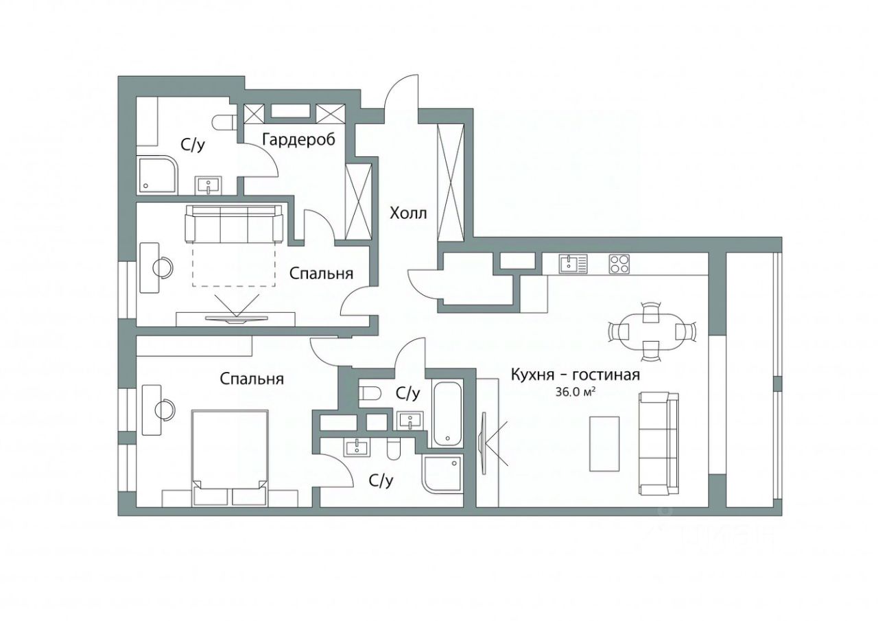 ПЛАНИРОВКА: -просторная кухня-гостиная - 36 кв. м., -мастер спальня с гардеробной зоной и с/у - 19,7 кв. м., -детская комната с с/у - 21,5 кв. м., -гостевой с/у, постирочная.
