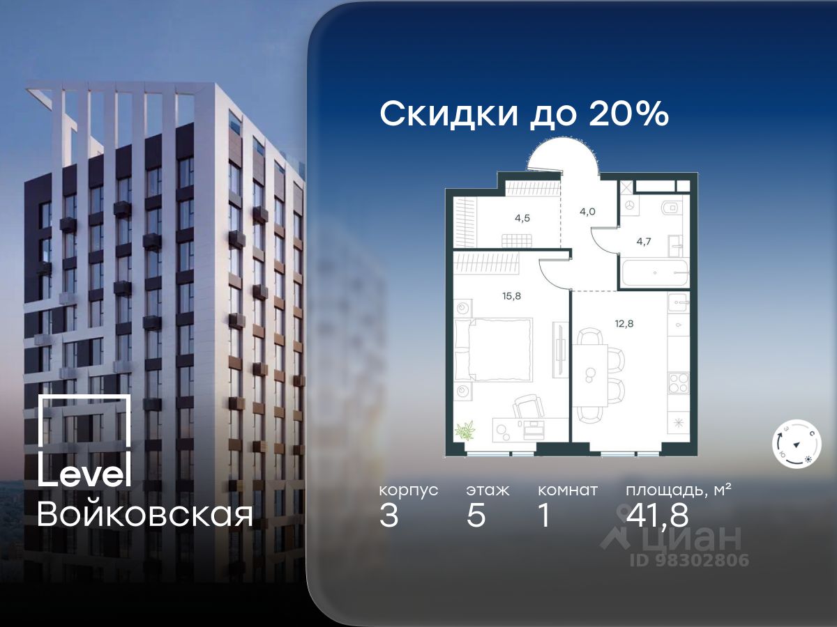 Продается 1-комнатная квартира площадью 41.80 кв. м без отделки. Квартира находится на 5 этаже 20-этажного корпуса 3, в новом жилом комплексе бизнес-класса Level Войковская, расположенном рядом с живописным заповедником ''Покровское-Стрешнево'' (застройщик - компания Level Group/Левел групп).