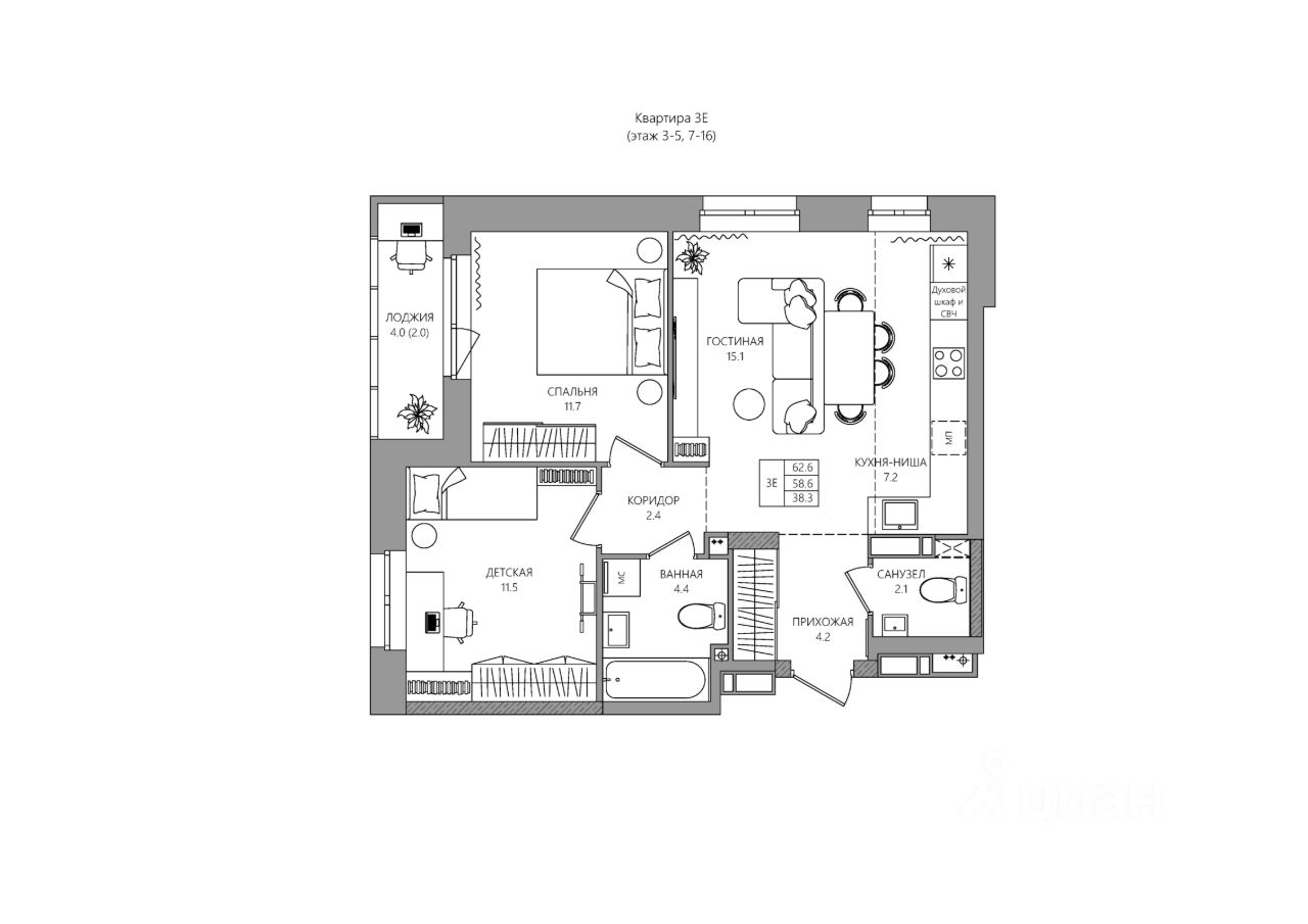 Общая площадь60,6 м2