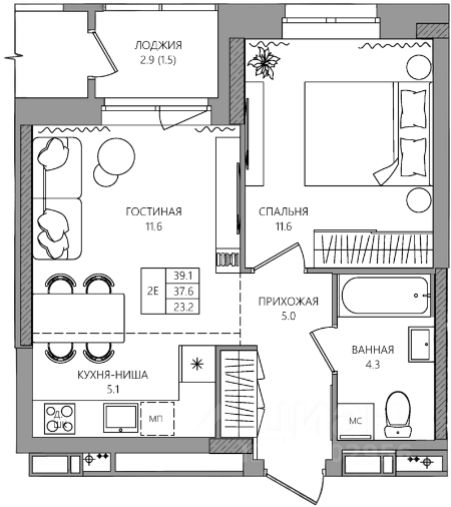 Общая площадь39,1 м2