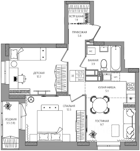 Общая площадь52,9 м2