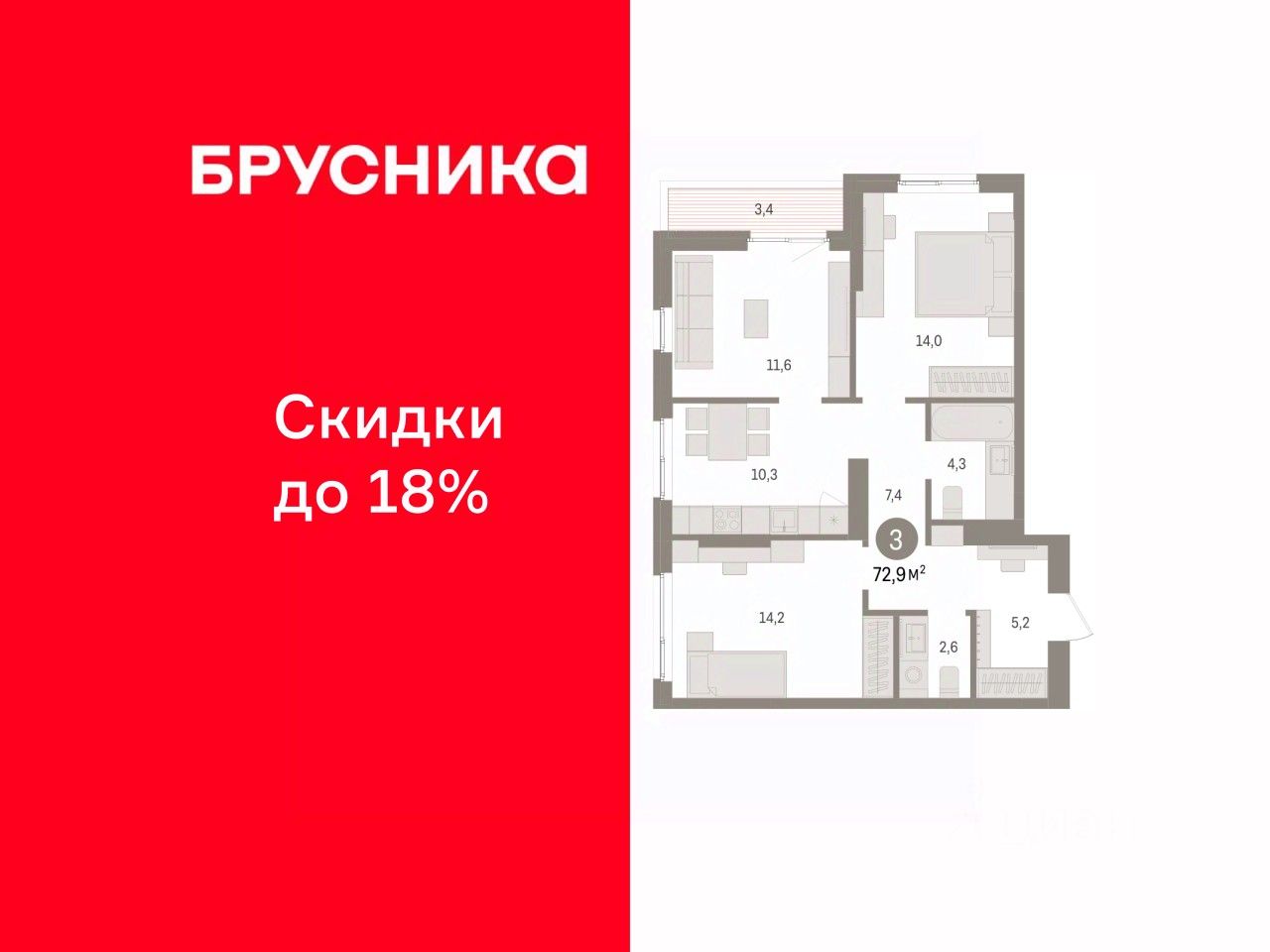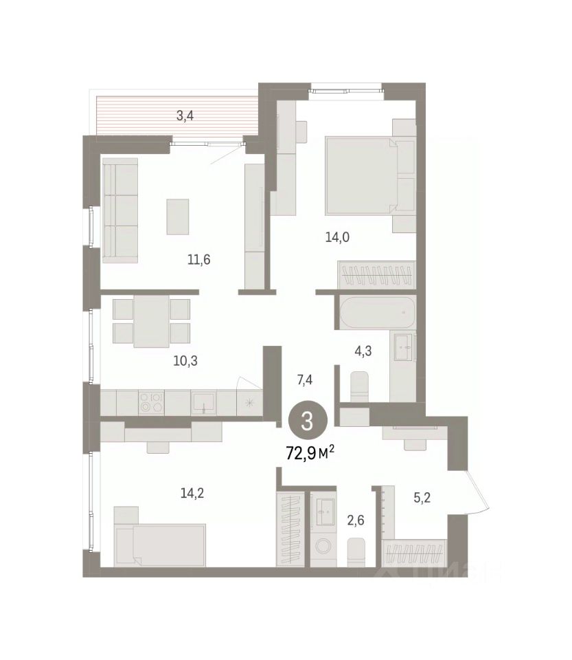 Квартира с кухней-гостиной и тремя спальнями в квартале ''Юность''. Особенности планировки: балкон, вид во двор, второй санузел, разнесённые спальни. квартиры в нашей базе: ЮСТ01-Ж1.8.3.