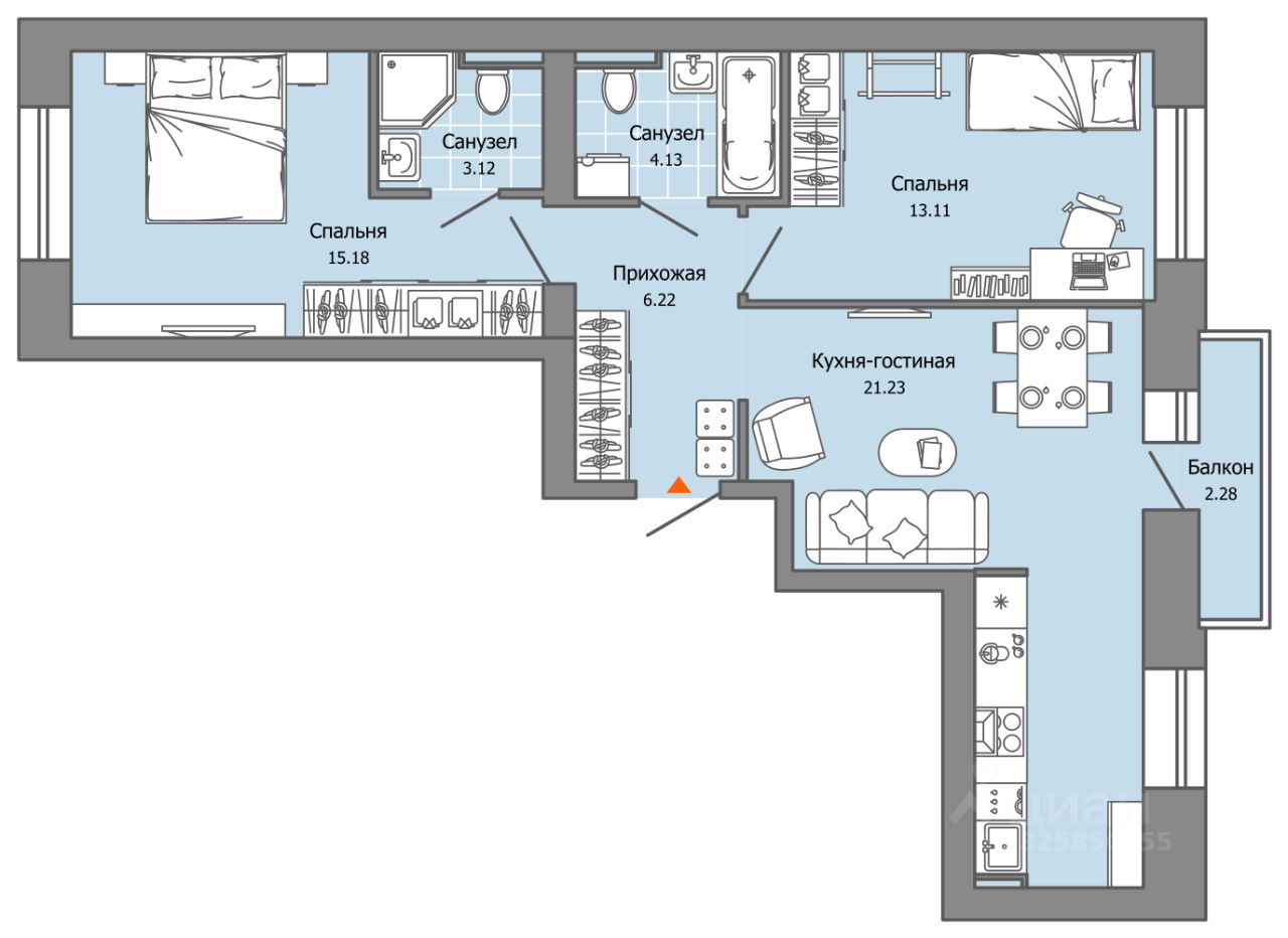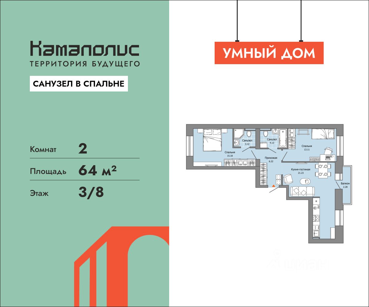 В новом жилом комплексе комфорт+ класса ''Камаполис'', расположенном на берегу реки Камы, продается 2-комнатная квартира площадью 64.00 кв. м. с предчистовой отделкой. Квартира находится в 4 доме. Девелопер проекта - ''Железно''.