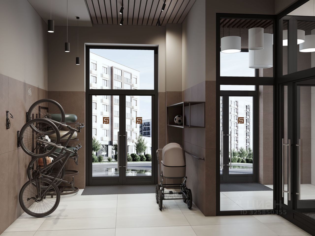 Концептуальные лобби Концепция проекта продолжается интерьером лобби. Здесь преобладают естественные оттенки и текстуры, а мебель выполнена из экологичных материалов. Для удобства жителей созданы собственные колясочные и велосипедные, а для заботы о домашних любимцах предусмотрена лапомойка.