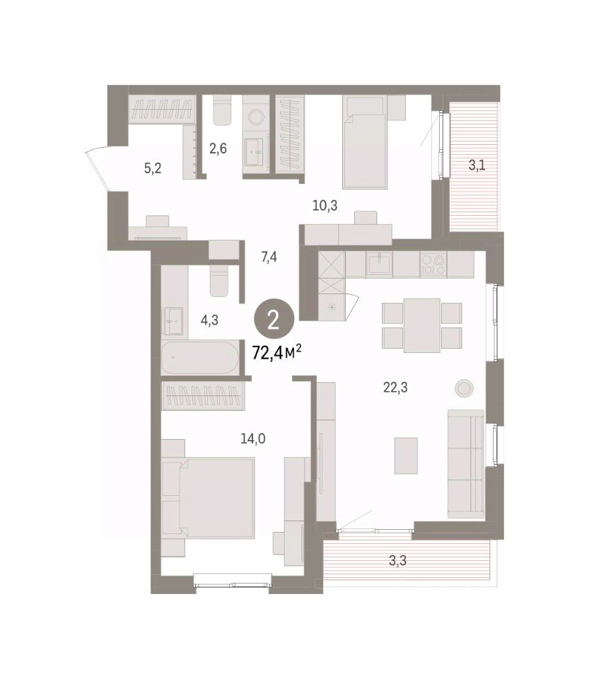 Квартира с кухней-гостиной и двумя спальнями в квартале ''Юность''. Особенности планировки: вид во двор, второй санузел, лоджия, разнесённые спальни. квартиры в нашей базе: ЮСТ01-Ж1.3.7.