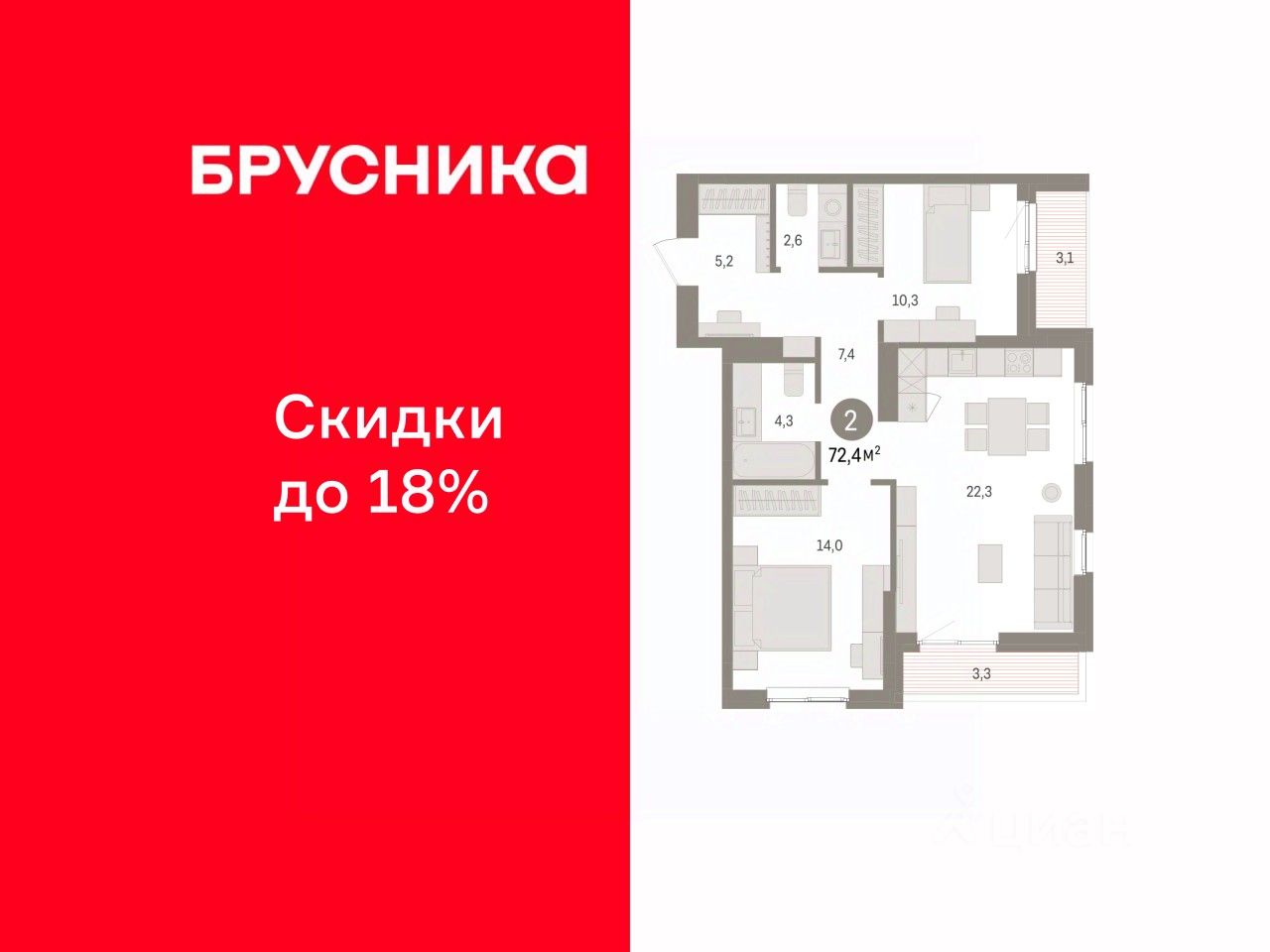 Квартира с кухней-гостиной и двумя спальнями в квартале ''Юность''. Особенности планировки: вид во двор, второй санузел, лоджия, разнесённые спальни.