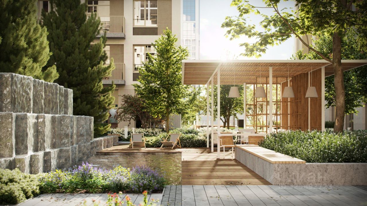 Благоустройство жилого комплекса это синтез искусства и природы. Поющие музыкальные инсталляции и поэтический променад. Оркестр растений: сирень, гортензии и яблони, чья цветущая палитра сменяется в течение года.