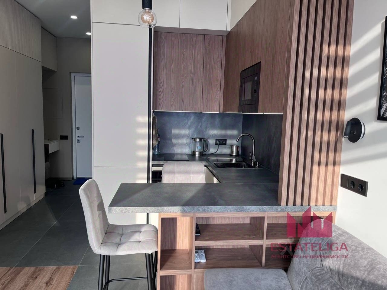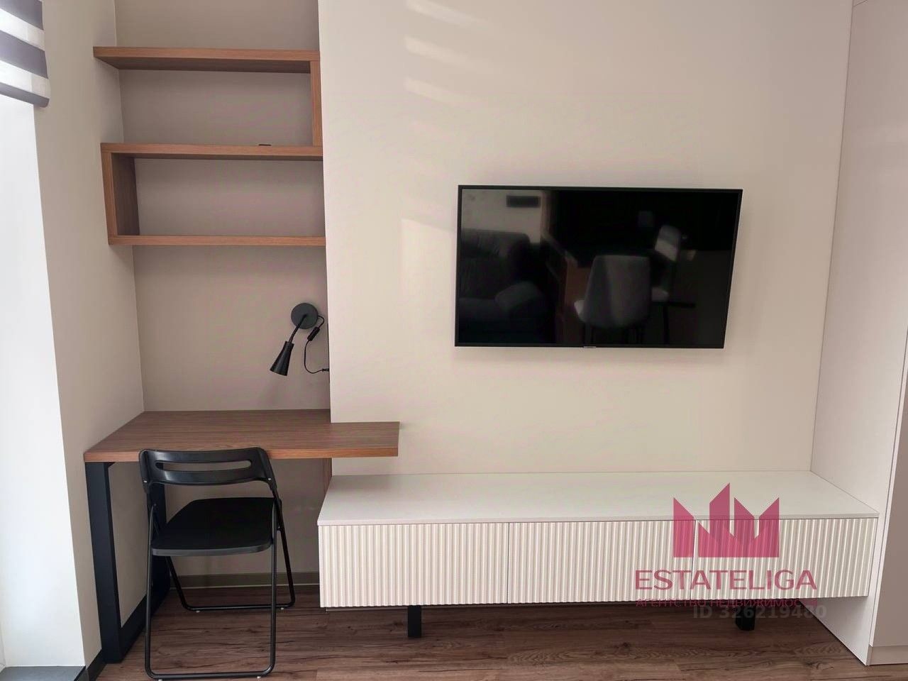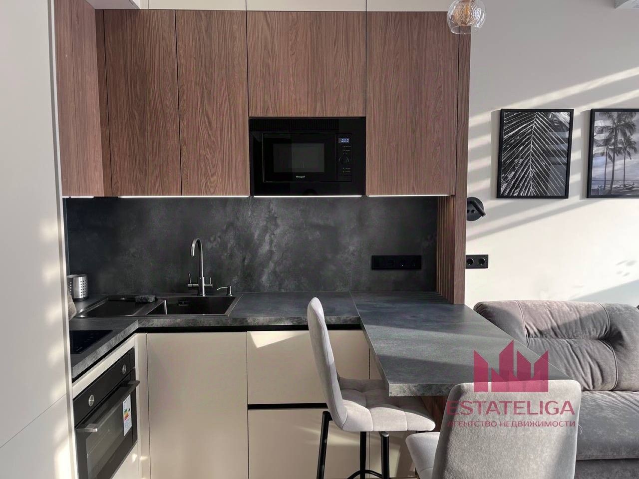 Студия оборудована всей необходимой мебелью и современной техникой: кондиционер, микроволновка, духовой шкаф, варочная панель, вытяжка, телевизор, стиральная машинка и многофункциональные вместительные шкафы. Интернет уже подключен, поэтому можно легко оставаться на связи.