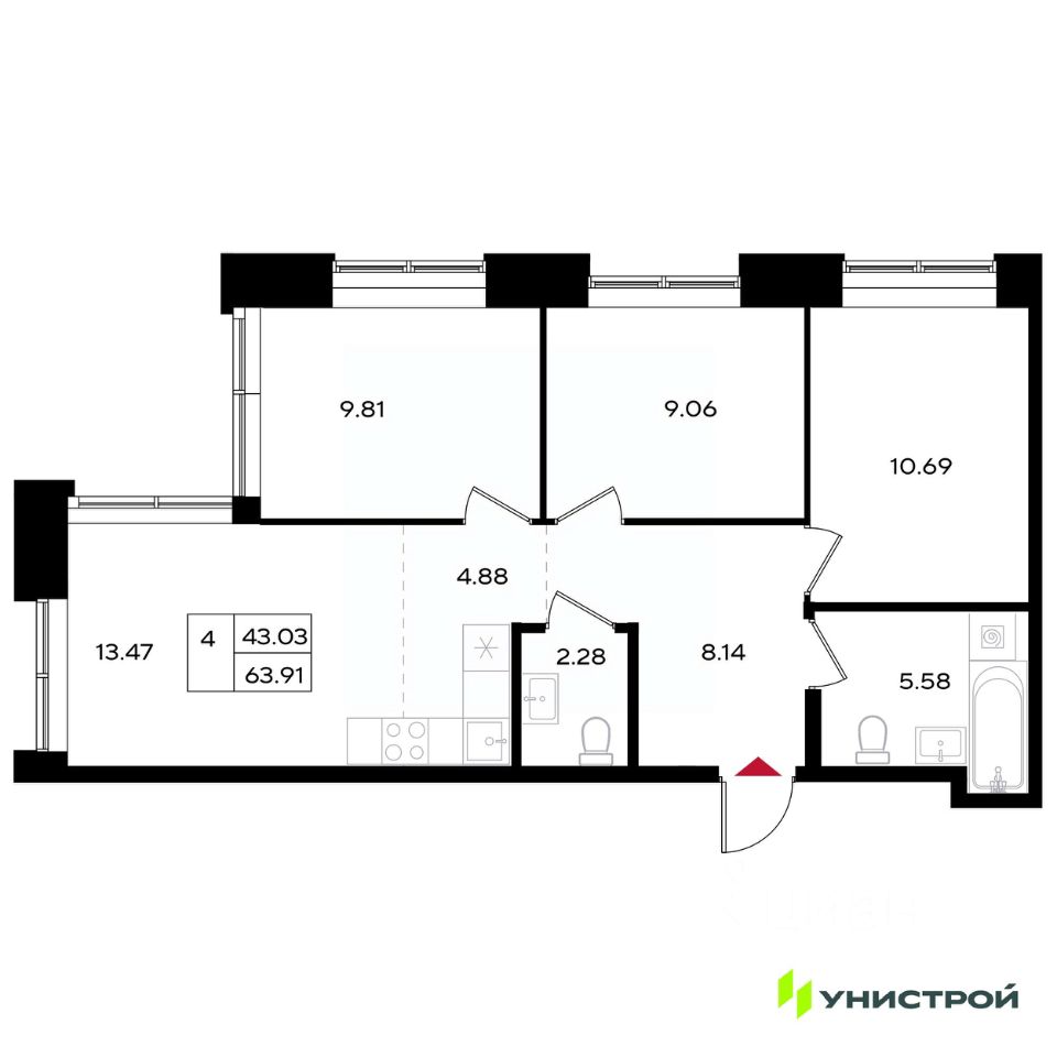 Общая площадь63,91 м2